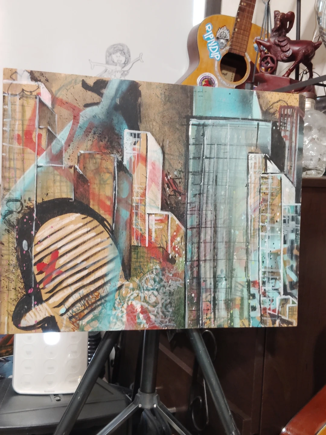 This is a mixed media painting featuring an abstract cityscape. It's created with various textures and colours, giving it a unique urban feel. The artwork would add a modern touch to any space.
