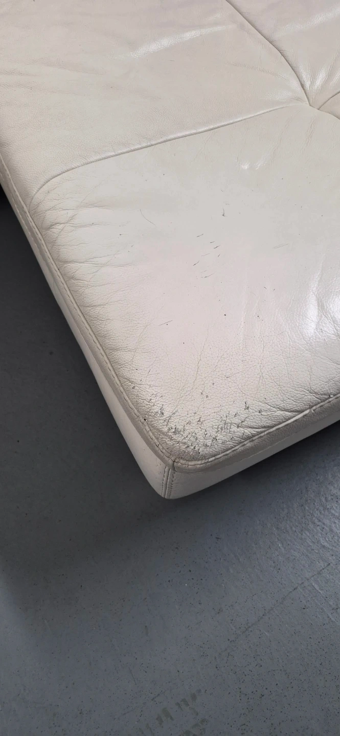 A white leather sectional sofa. The material is real leather purchased from Ashley Furniture for over$3,000. It has some scuffs and wear on the edges from our cat. Right facing sectional. This sofa would fit well in a living room or large den.