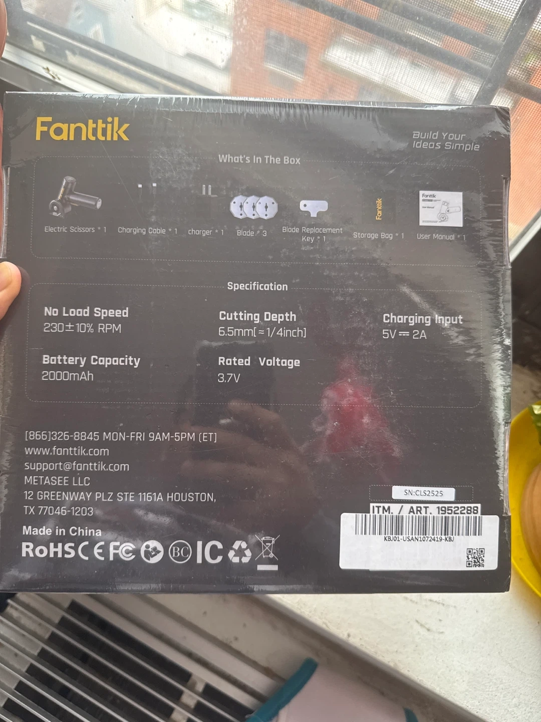 This is the Fanttik R100 PRO Cordless Electric Scissors. It features a 230RPM cutting speed and a 5.5mm cutting depth. The battery capacity is 2000mAh and it comes with a charging cable, charger, 3 blades, blade replacement key, and a storage bag.