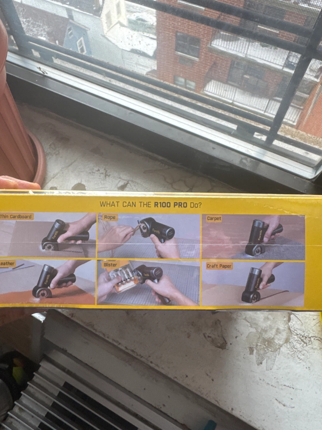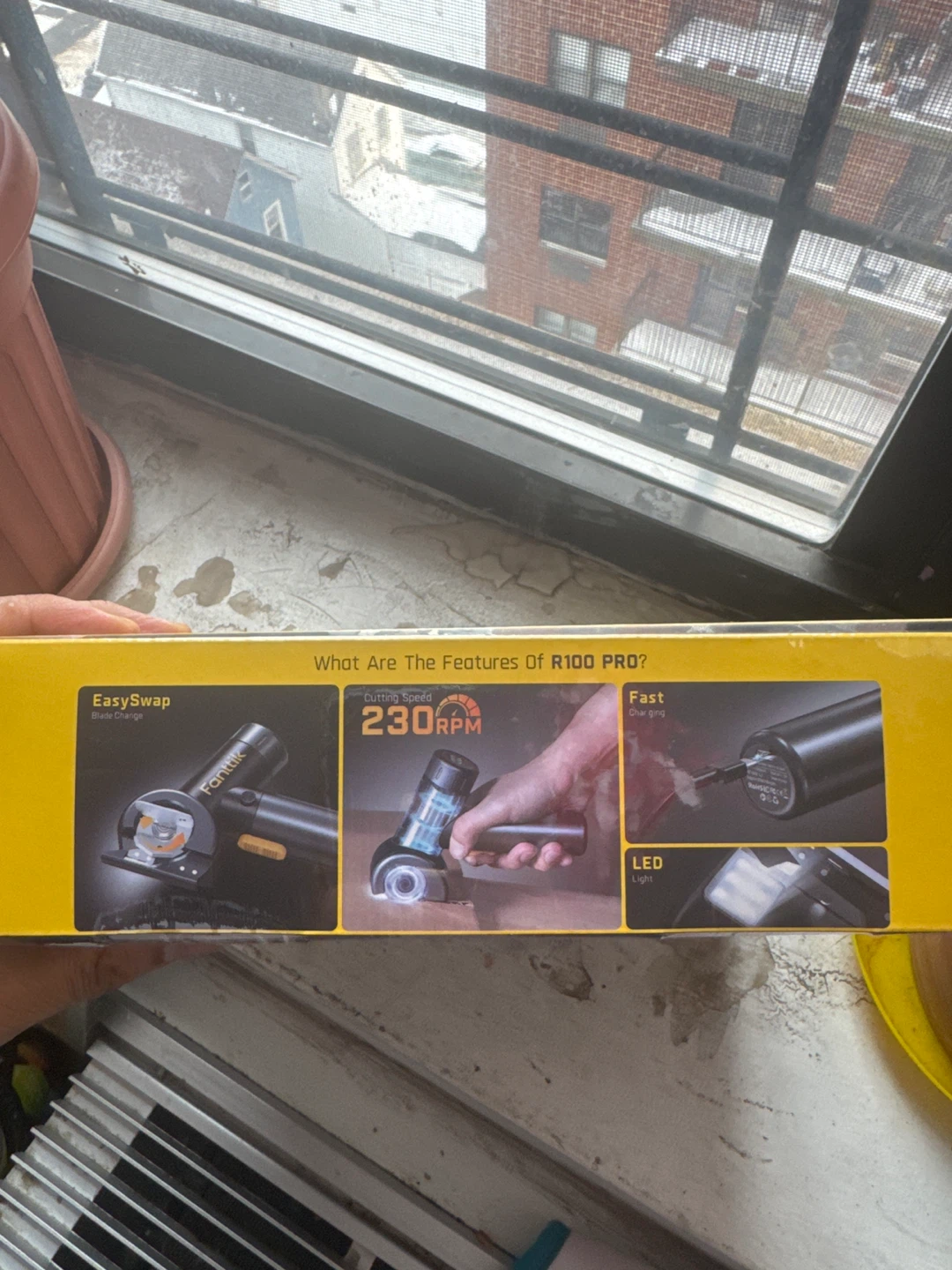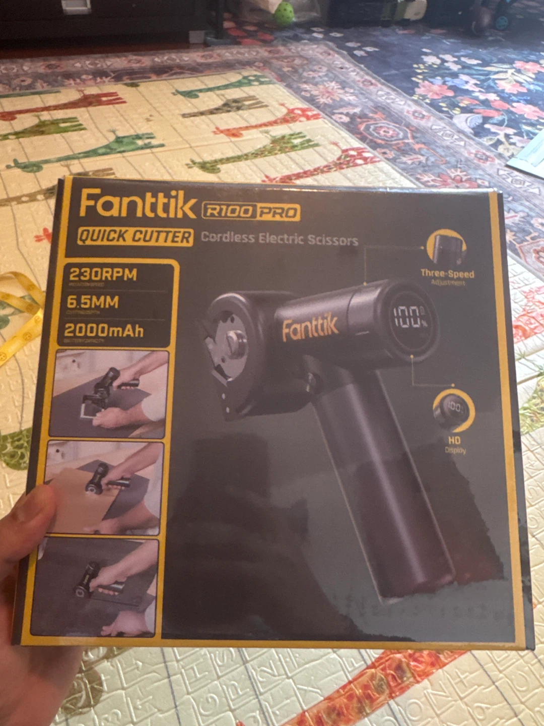 This is the Fanttik R100 PRO Cordless Electric Scissors. It features a 230RPM cutting speed and a 5.5mm cutting depth. The battery capacity is 2000mAh and it comes with a charging cable, charger, 3 blades, blade replacement key, and a storage bag.