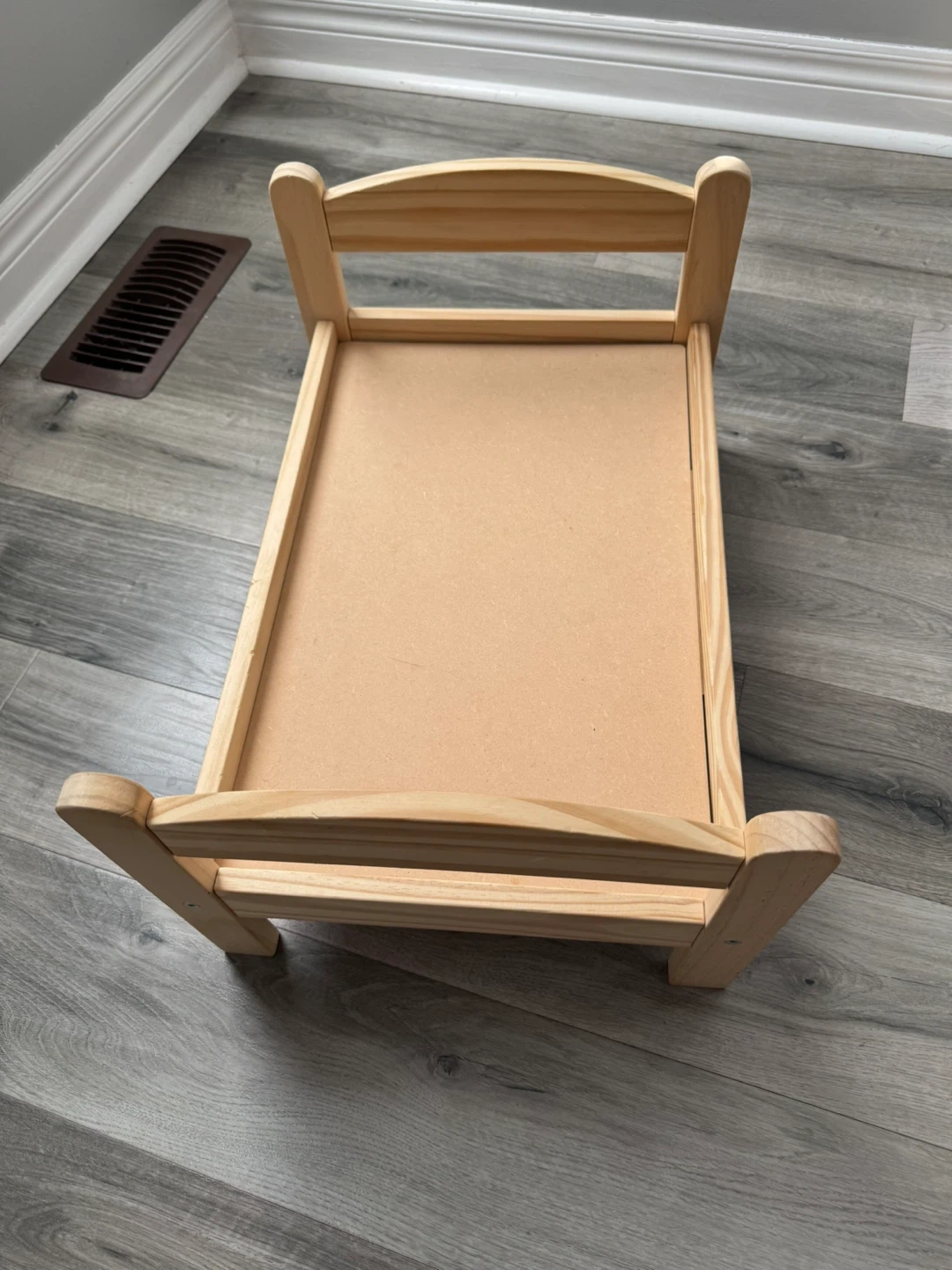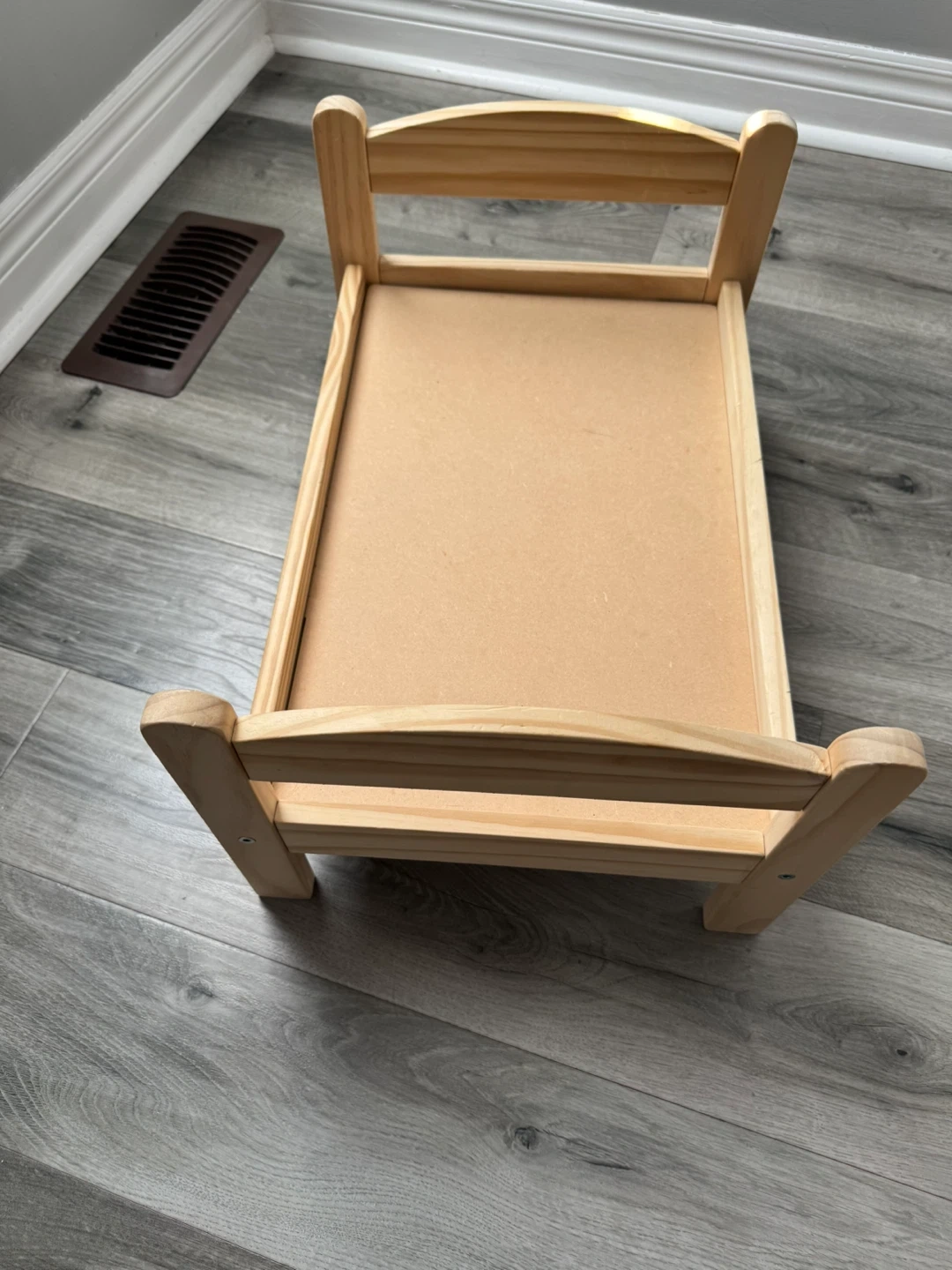A charming wooden bed designed for dolls. It's made from natural wood and features a simple, sturdy construction. Perfect for a child's imaginative play!
