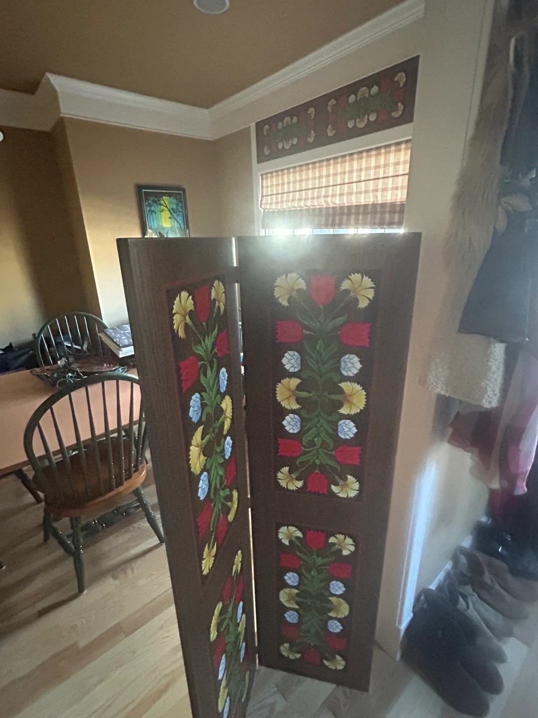 This two-panel wooden room divider features a beautiful hand-painted floral design with tulips and other flowers. It's a charming piece that can add a decorative touch to any room. The wood has a rich, dark finish.
