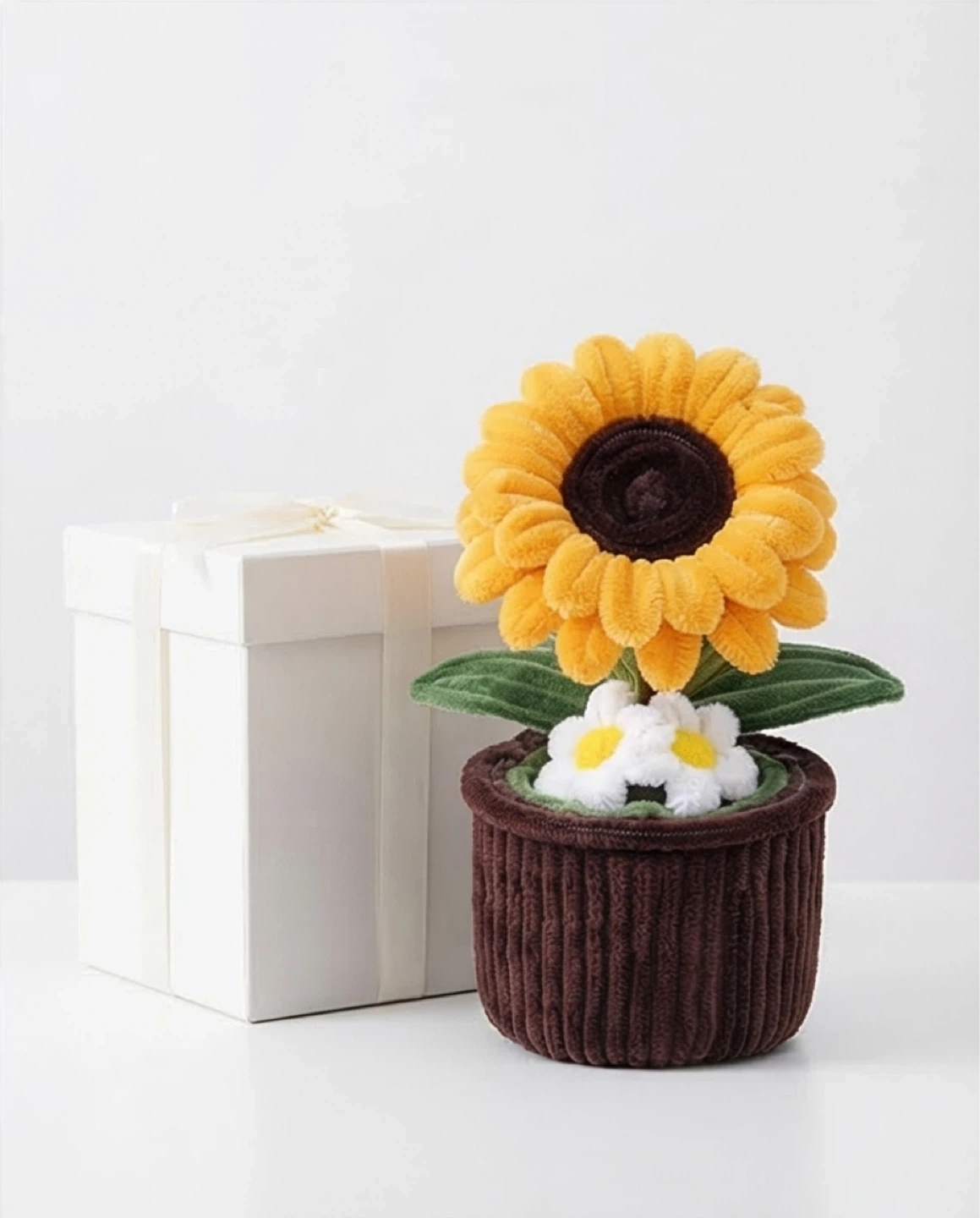 This is a cute plush sunflower in a brown corduroy pot, with smaller white flowers at the base. It comes with a white gift box tied with a ribbon. Plush material.
