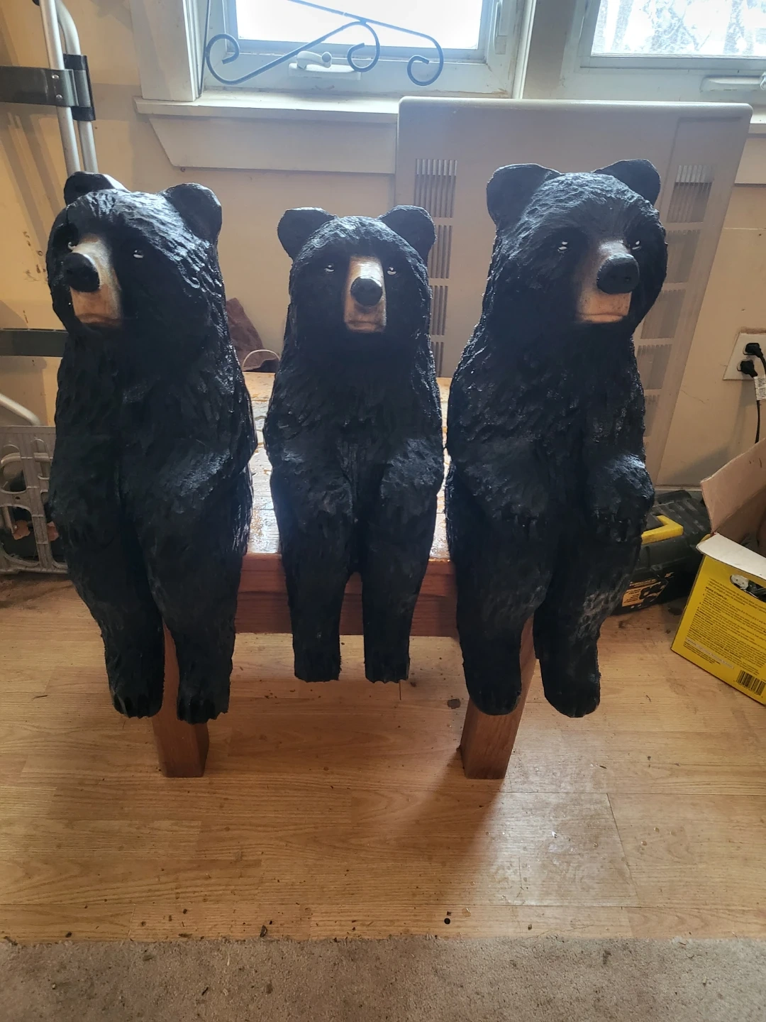 A charming set of three black bear carvings, perfect for adding a touch of rustic decor. These wooden figures have a detailed finish and are designed to sit on a ledge or surface. They'd make a great addition to a cabin, porch, or wildlife-themed room!