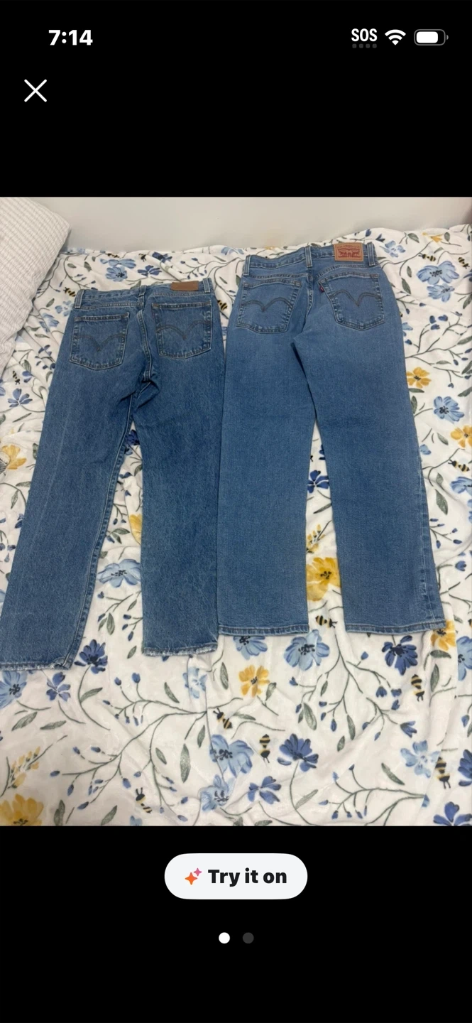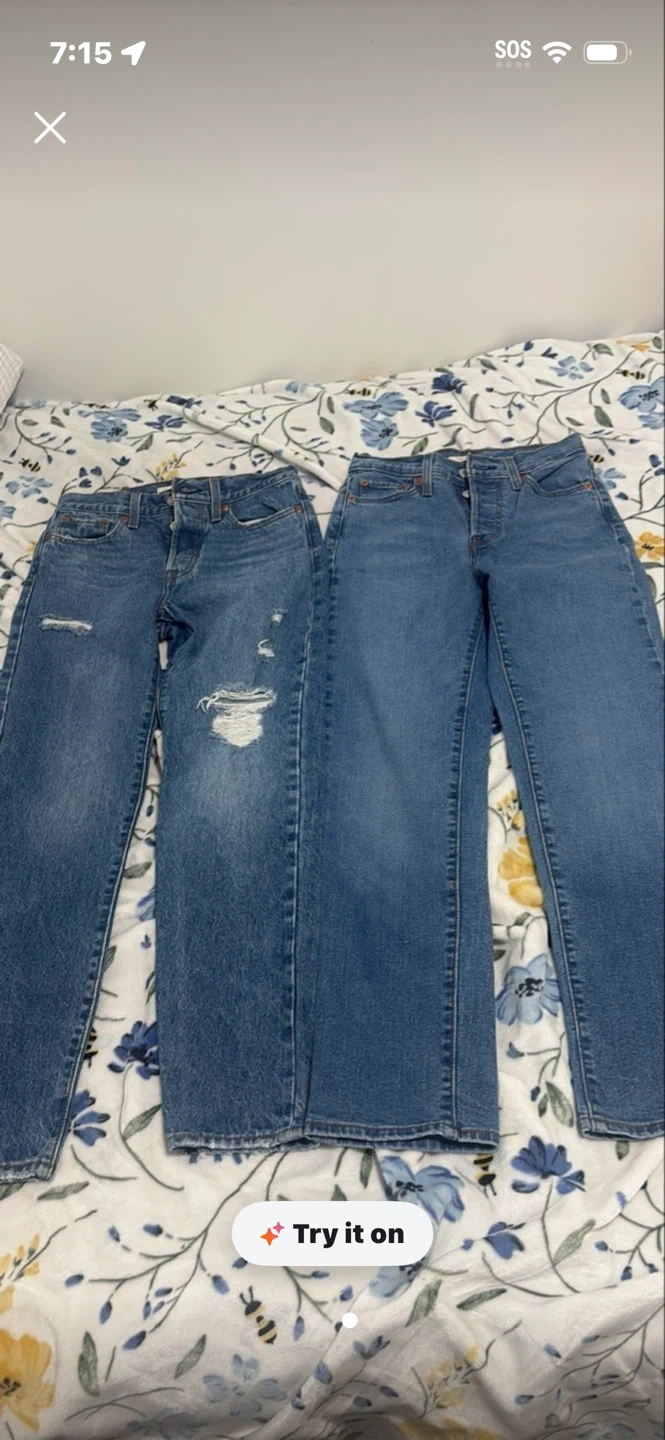 Two pairs of classic Levi's denim jeans. One pair has distressed detailing and ripped sections. Both offer a 20 each comfortable, timeless fit. Pick up cash only