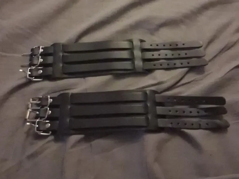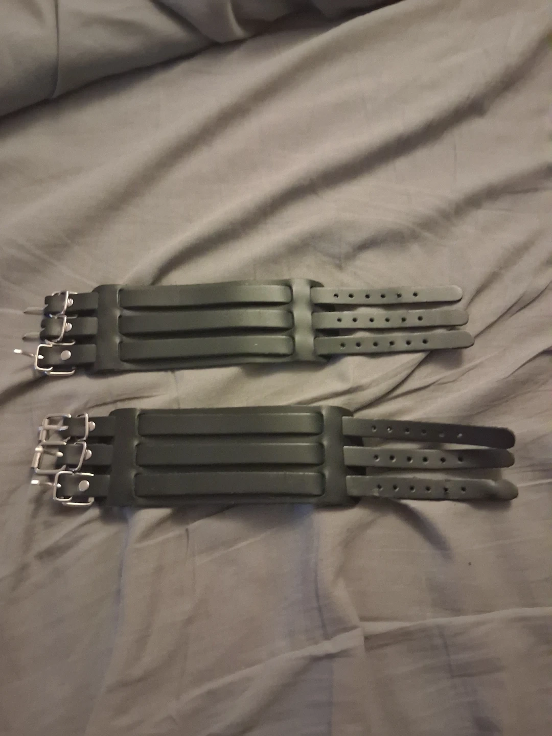 A pair of black leather cuff wristbands with metal buckles. These have adjustable straps with multiple holes for a custom fit. Material is genuine leather.