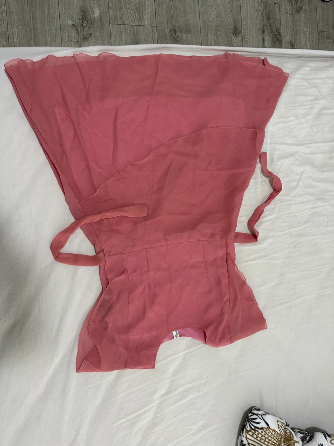 A lovely dusty rose chiffon dress with ruffle short sleeves and an asymmetrical hem. It comes with a tie belt for a cinched waist. This dress is perfect for a sunny day out!