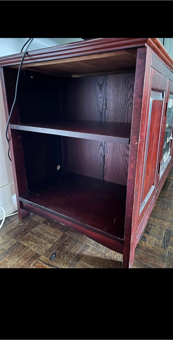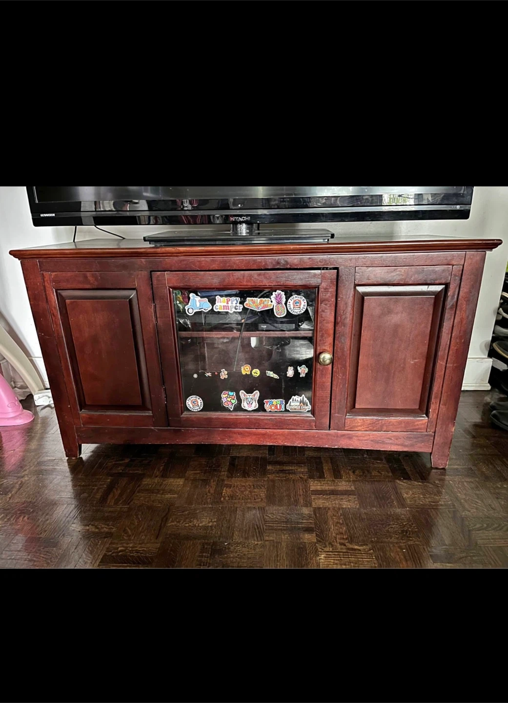Selling a wooden TV stand. It has a glass door with stickers on it, and shelves for storage. It's a great piece for any living room.