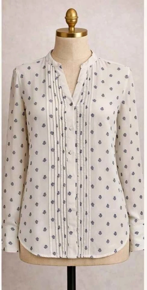 Elegant white/cream blouse with navy floral prints and beautiful pleated detailing down the front. Soft lightweight fabric. Feminine floral pattern. Size 4. Pleated front design for a flattering fit. Long sleeves with button cuffs. Easy to dress up or wear casually. Perfect for office wear, brunch, or everyday outfits.