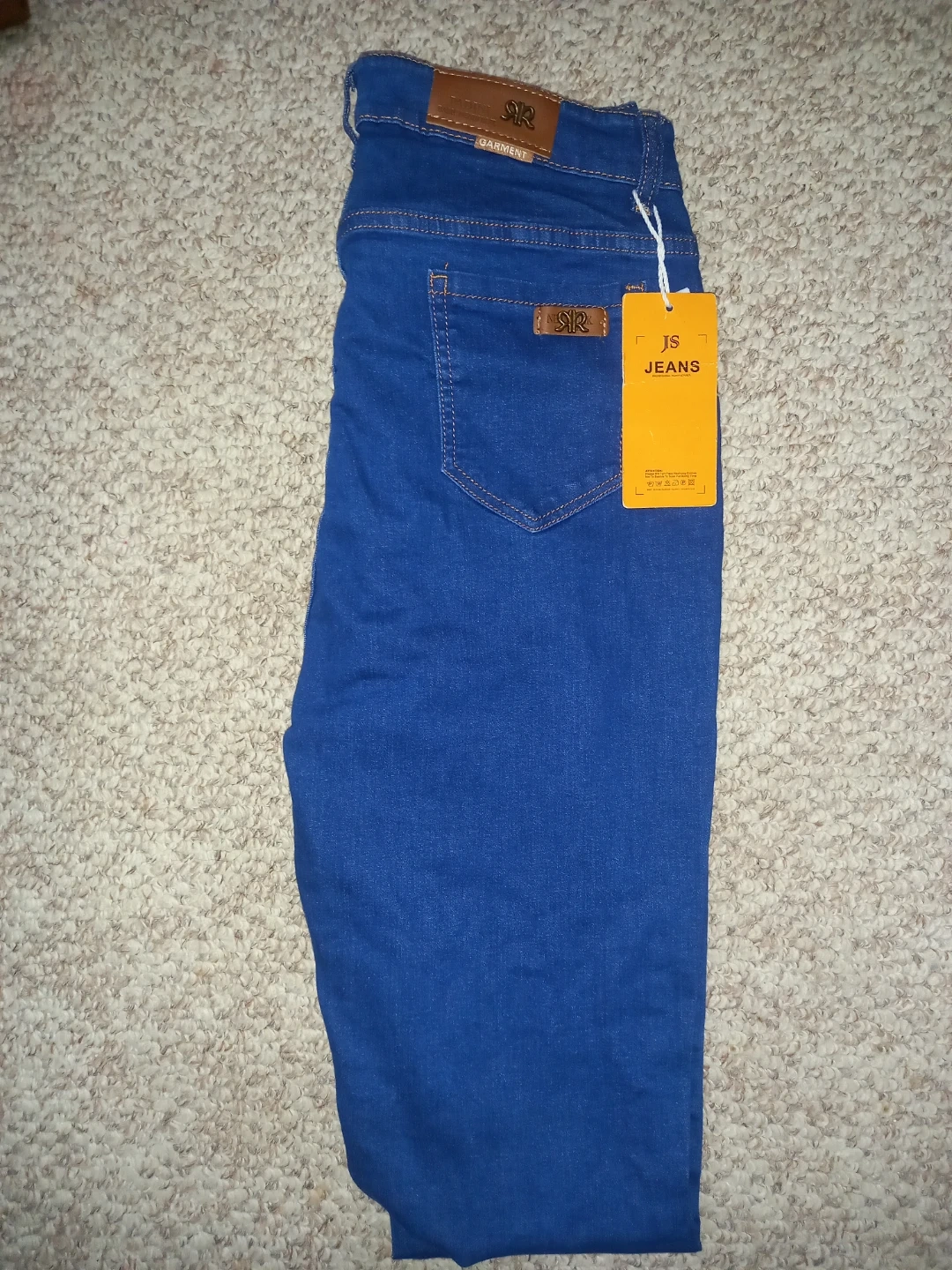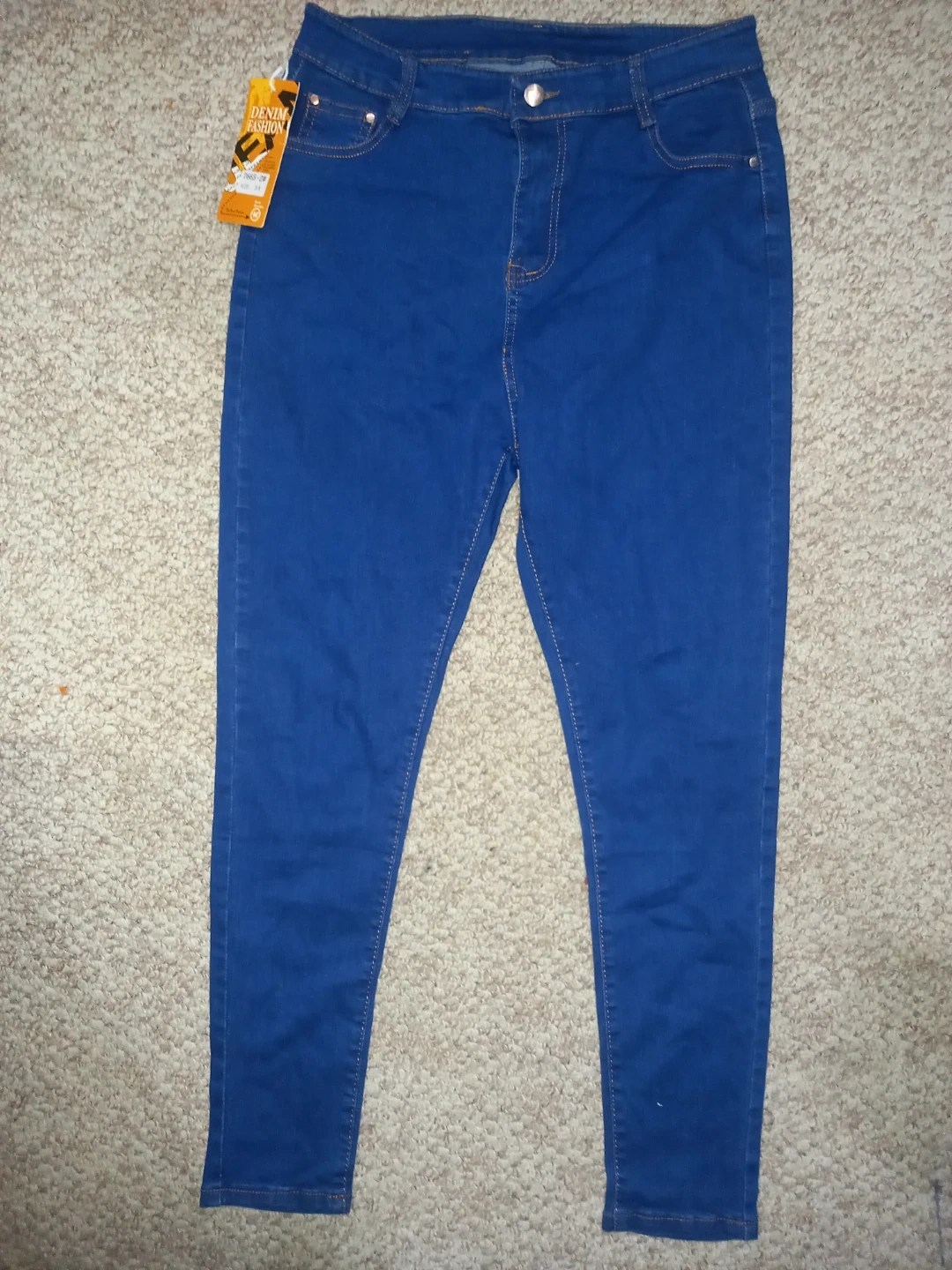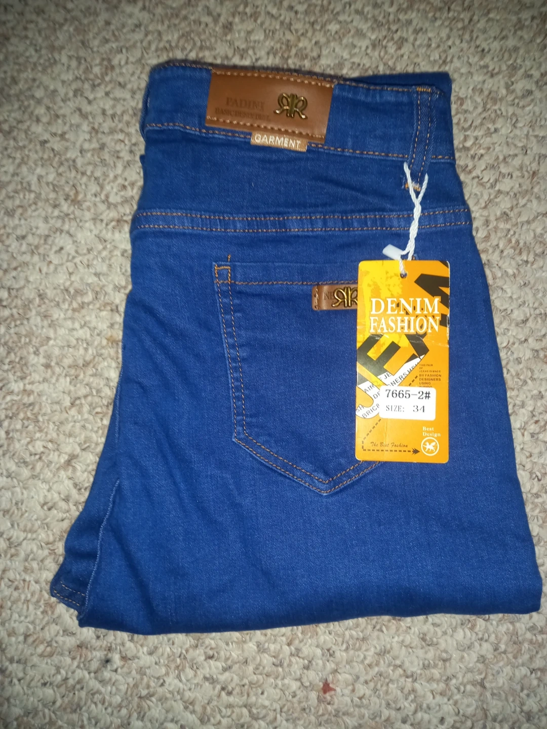 Blue denim jeans with a "Denim Fashion" tag. Size is 34. They're made with denim material.