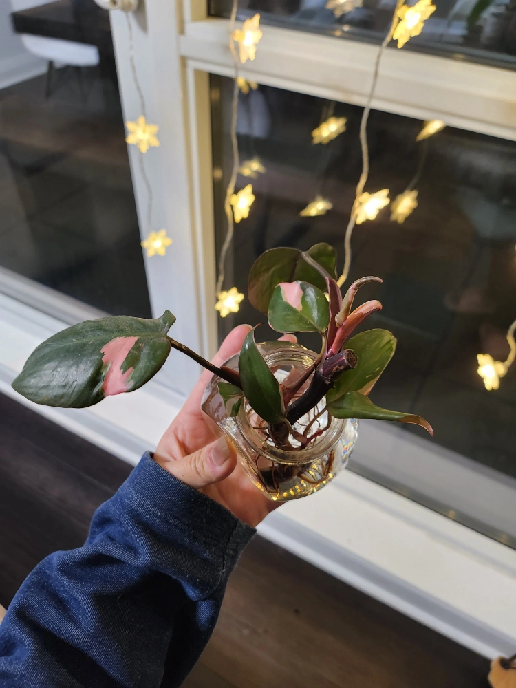Philodendron Pink Princess cutting in a glass jar. Roots visible. Ready for planting.