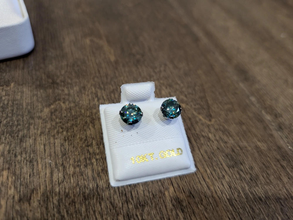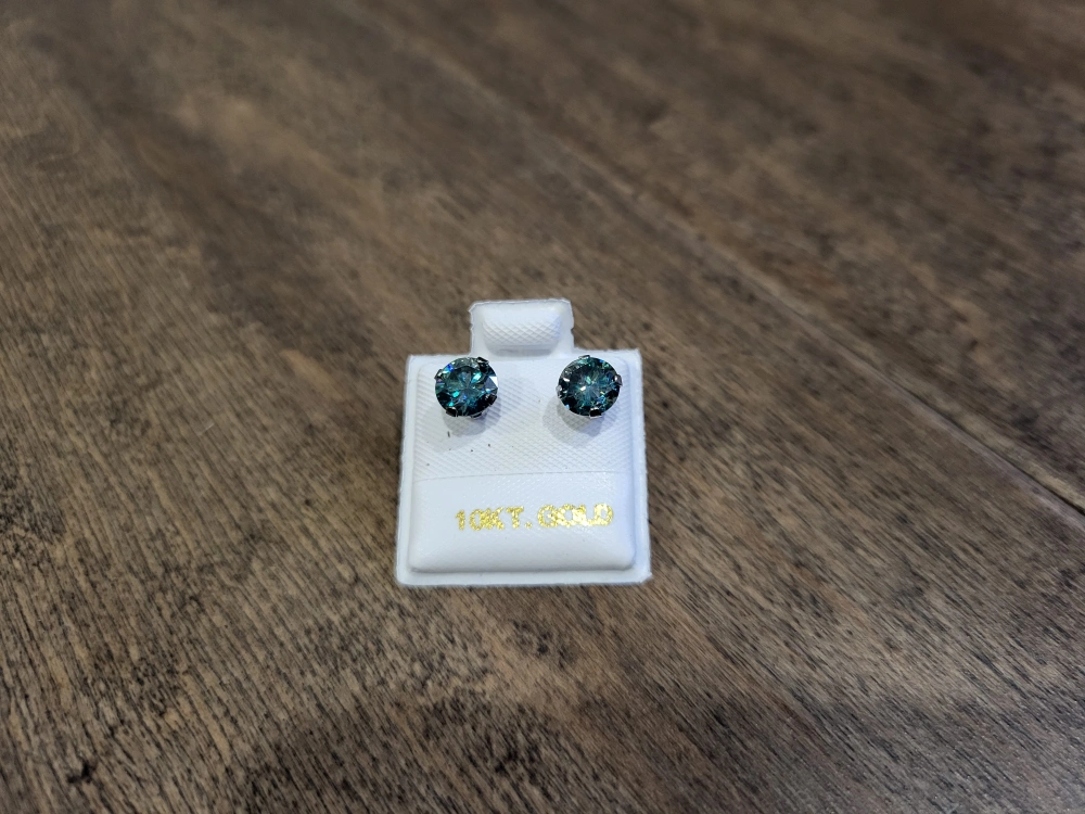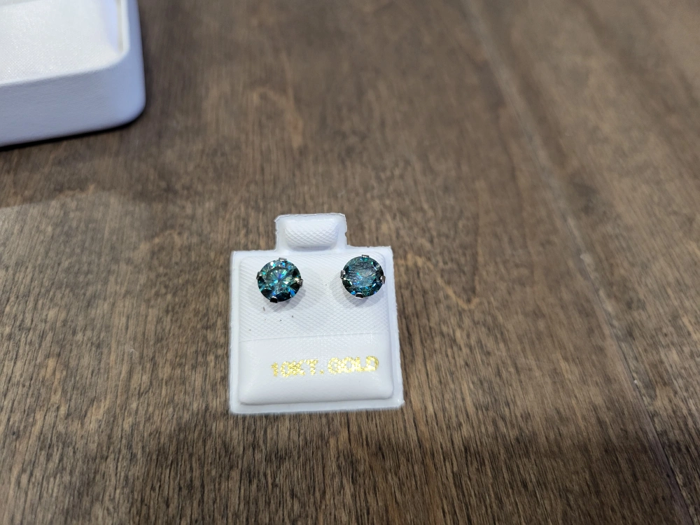 Pair of blue moissanite stud earrings. Set in 10 karat gold. elegant. 1.5ct karat, made in Canada.
