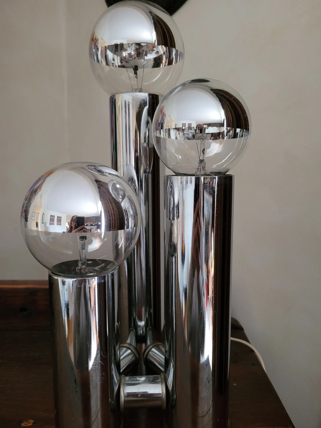 This striking 1960's chrome lamp features three spherical glass shades on cylindrical chrome bases. Bulbs are original. It has a dimmer switch for adjustable lighting. While it does work as seen in pictures, it might need rewired as it's old? It's currently in use...H:15"xW:6"