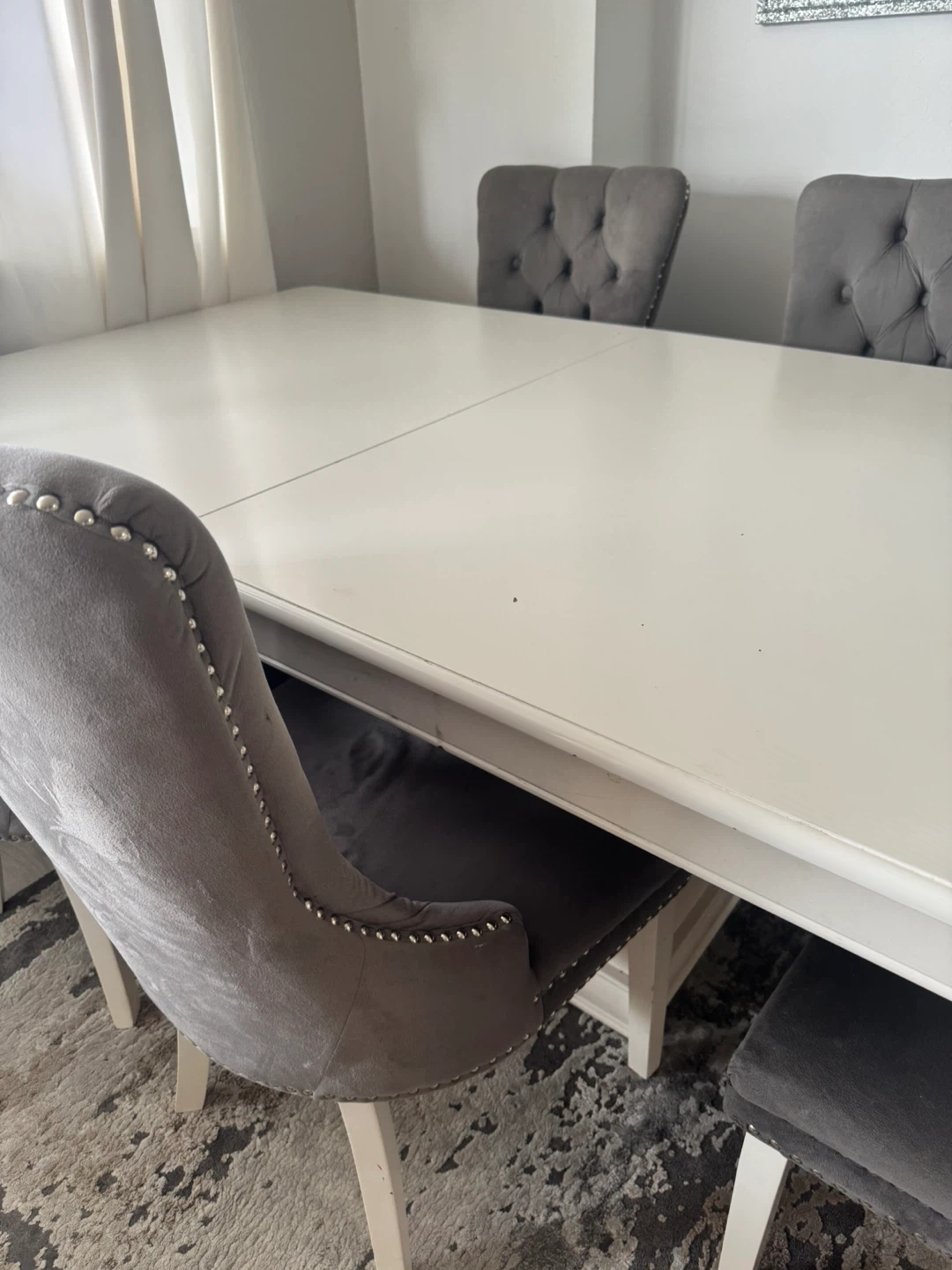 This dining set includes a white extendable table and 5 grey velvet tufted chairs with silver nailhead trim. Chairs have wooden legs and offer a comfortable, elegant seating experience. Perfect for family dinners or entertaining guests!