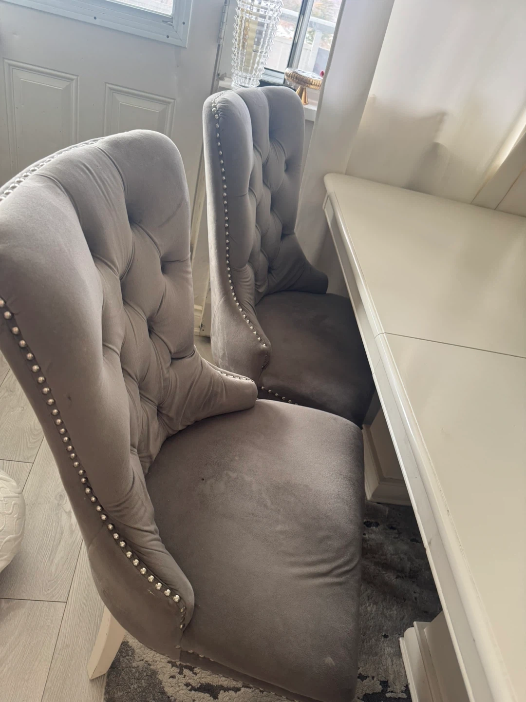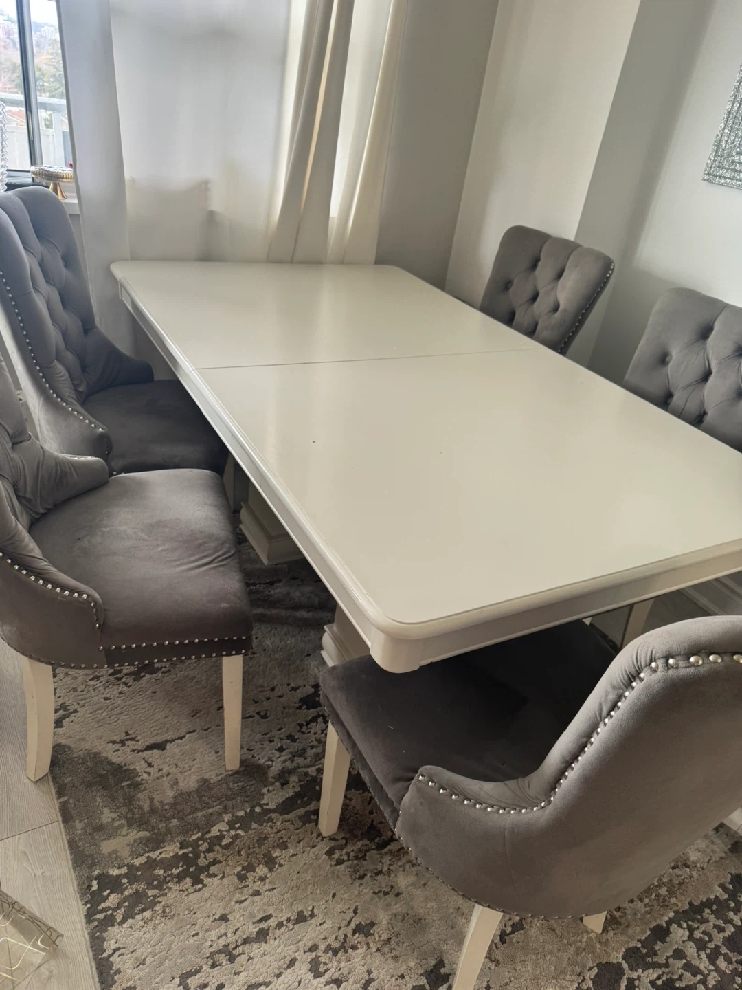 White Dining Table with Grey Tufted Chairs