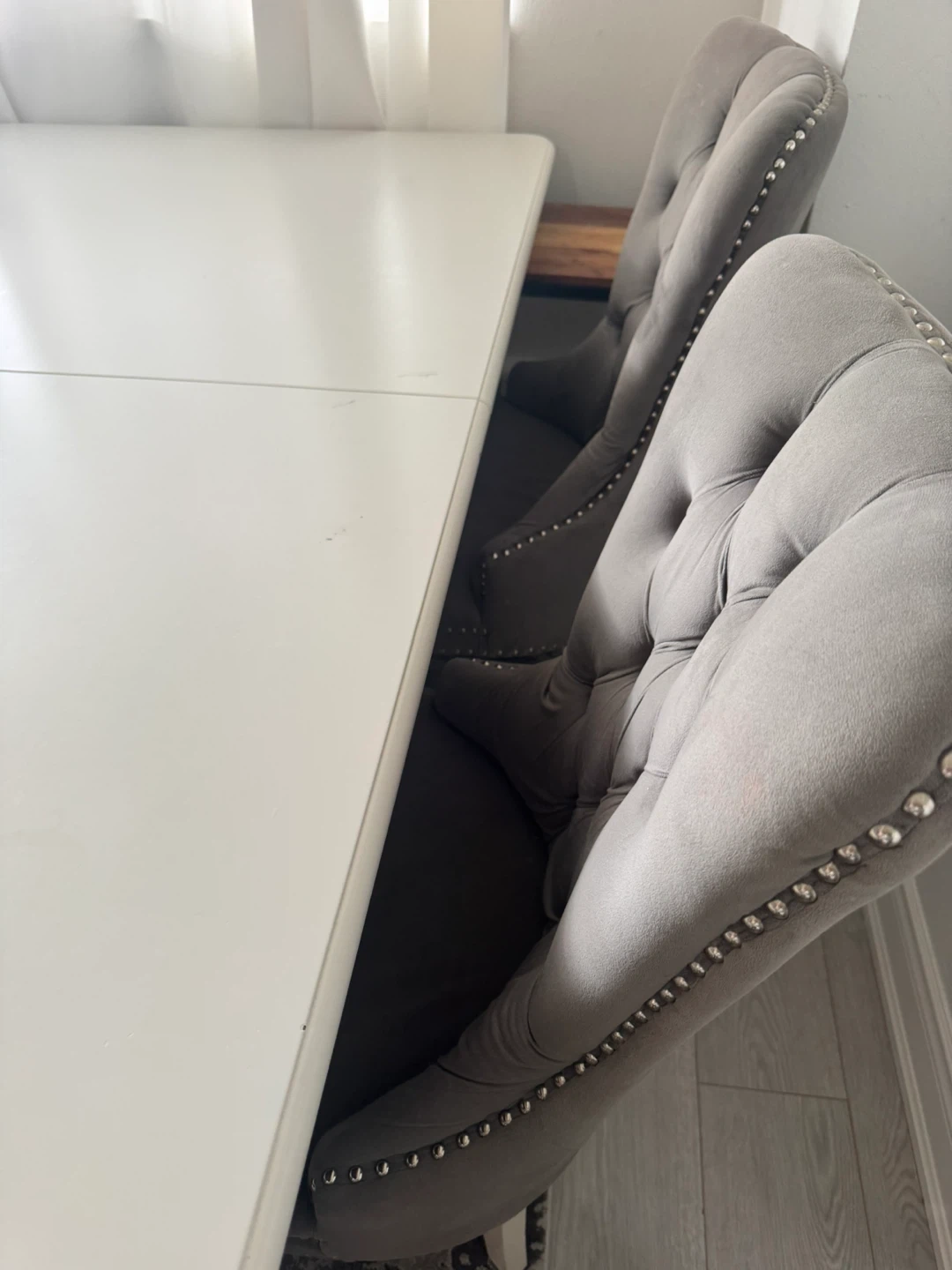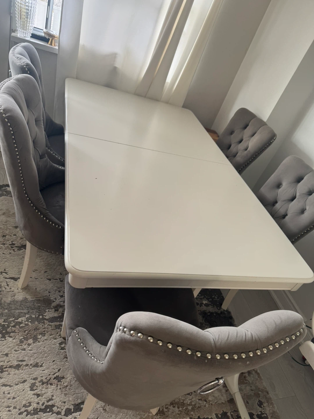 This dining set includes a white extendable table and 5 grey velvet tufted chairs with silver nailhead trim. Chairs have wooden legs and offer a comfortable, elegant seating experience. Perfect for family dinners or entertaining guests!