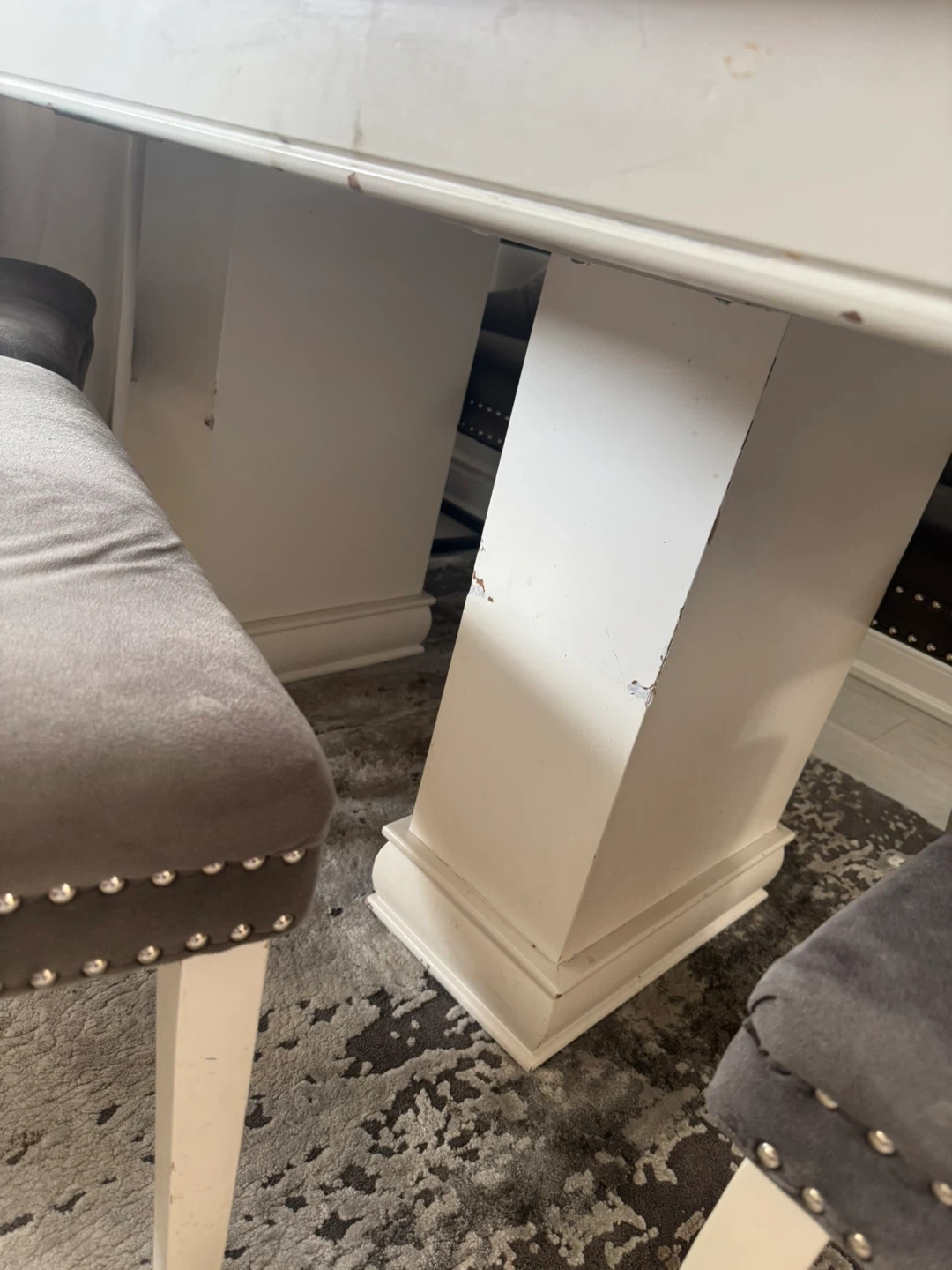 White Dining Table with Grey Tufted Chairs
