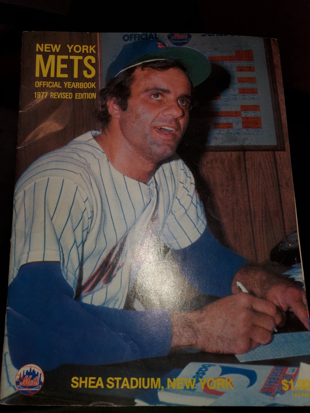This is the 1977 Revised Edition of the New York Mets Official Yearbook. It features Shea Stadium, New York. The cover has a picture of a player, and the price was $1.00.