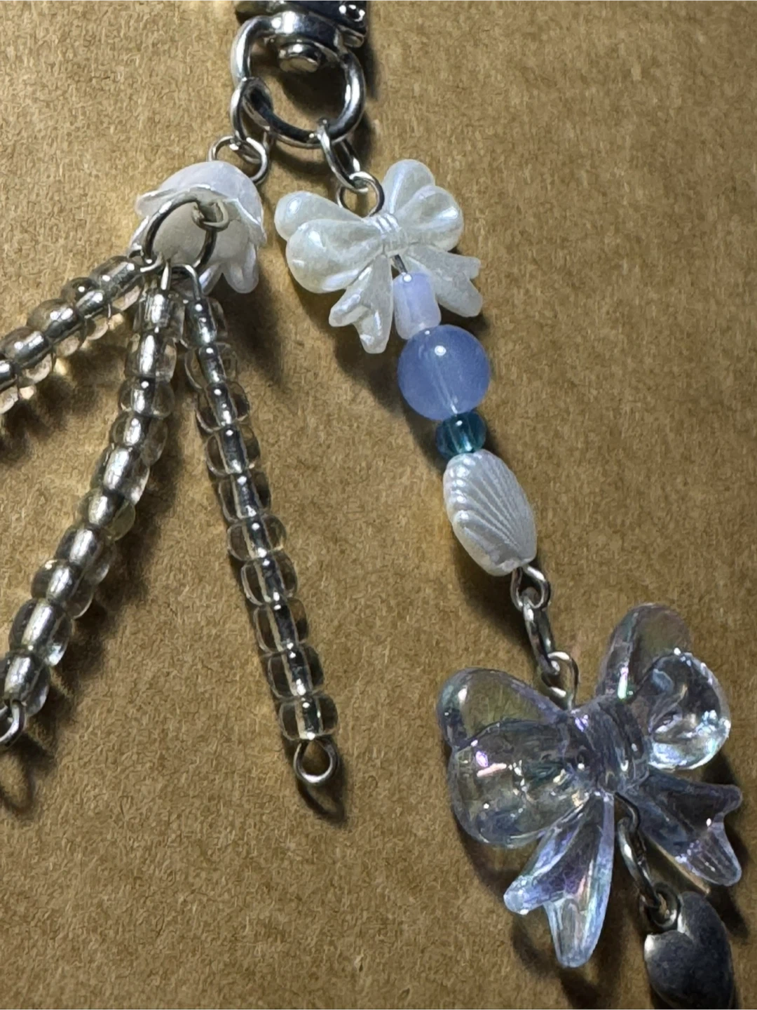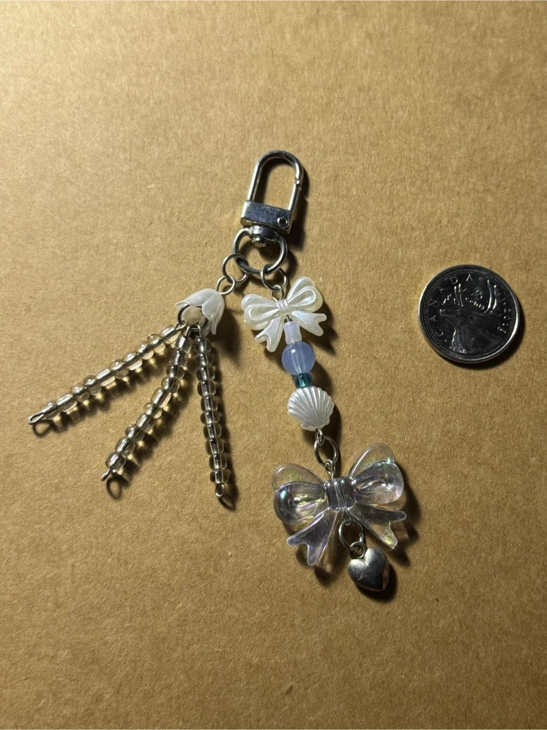 Cute keychain with a mix of beads, shell, and bow charms. Features a silver lobster clasp for easy attachment. Great for personalizing bags or keys!