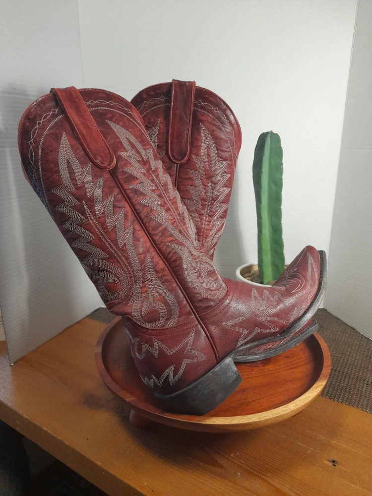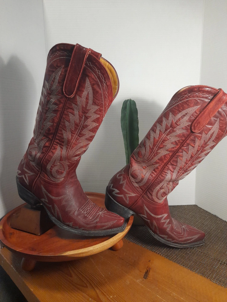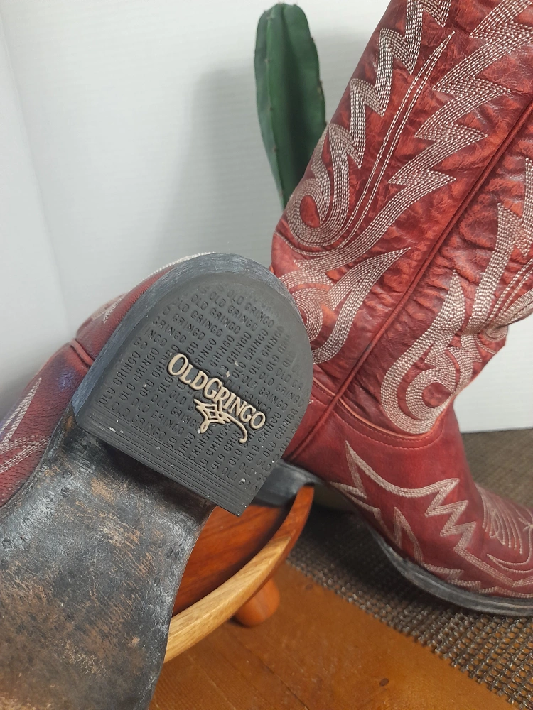 These are a pair of lovely red leather cowboy boots from Old Gringo. They have a beautiful stitched design and are in great condition. Perfect for adding a bit of western flair to your wardrobe!