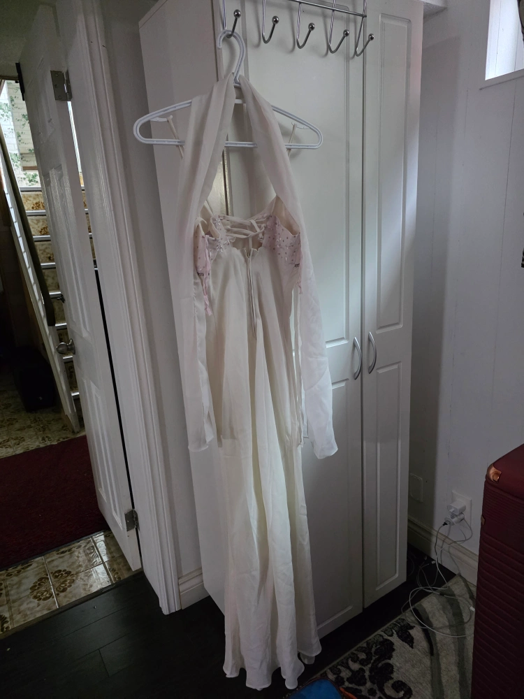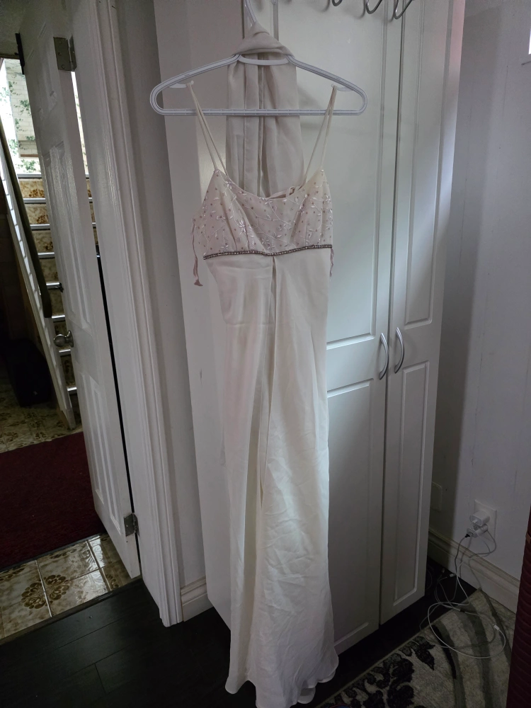 A beautiful dress in a soft, neutral colour. Features thin straps. Embellishments on the bodice. Long, flowing fabric. A lovely addition to any wardrobe for those special events in life.