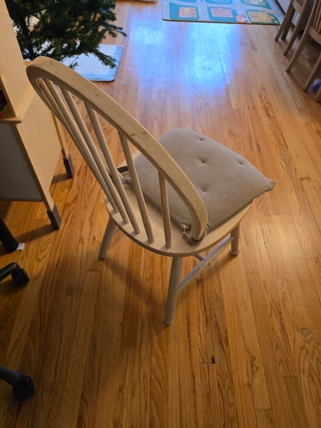 This is a wooden dining chair. It's perfect for adding a touch of classic style to your dining area or kitchen. The chair is in good condition and ready to use. It is a light color, making it easy to match with your existing decor