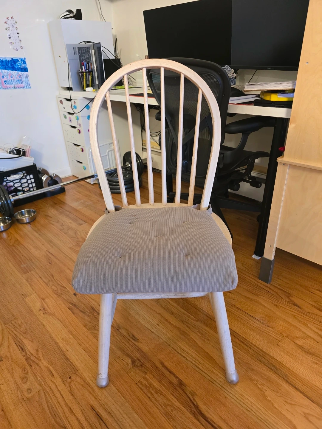 This is a wooden dining chair. It's perfect for adding a touch of classic style to your dining area or kitchen. The chair is in good condition and ready to use. It is a light color, making it easy to match with your existing decor