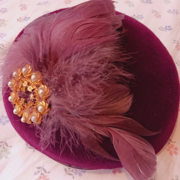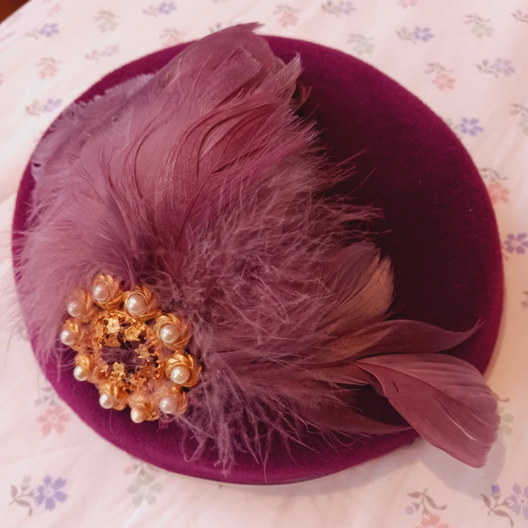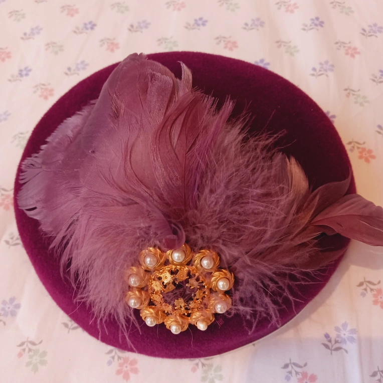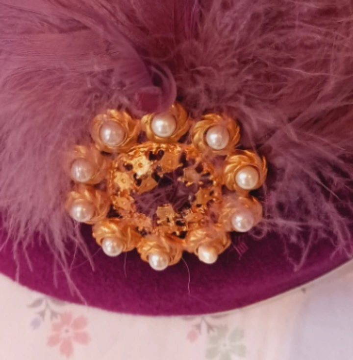 Gorgeous Purple Royal English Ladies' Hat with a feather trim and gold brooch with pearls. Excellent condition.
