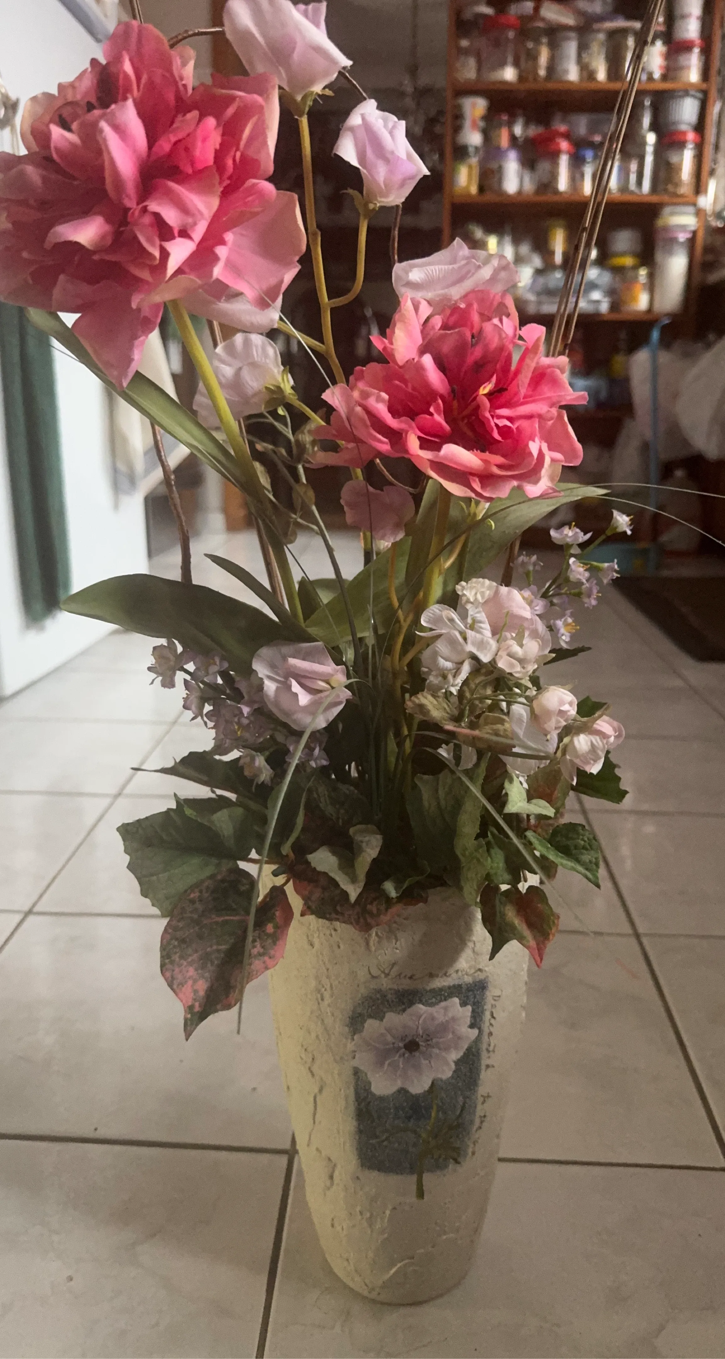 This faux floral arrangement features pink and white blooms in a textured vase with a floral decal. It's a lovely piece for home decor.