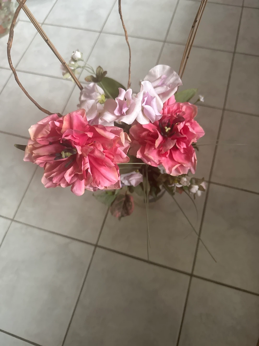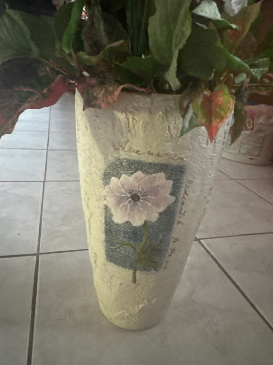 This faux floral arrangement features pink and white blooms in a textured vase with a floral decal. It's a lovely piece for home decor.
