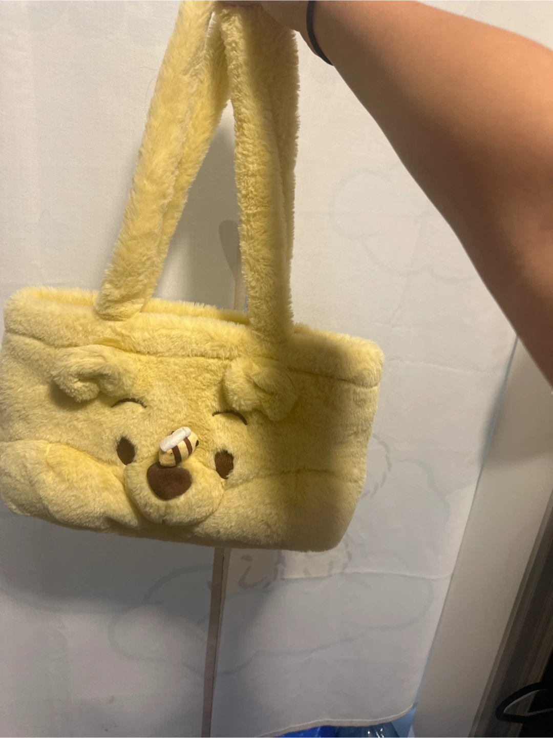 A super cute Winnie the Pooh plush bag! It's in great condition and ready for a new home. The bag is a soft, plush material and features Winnie the Pooh's face with a little bee on his nose. Perfect for carrying small items or as a fun accessory