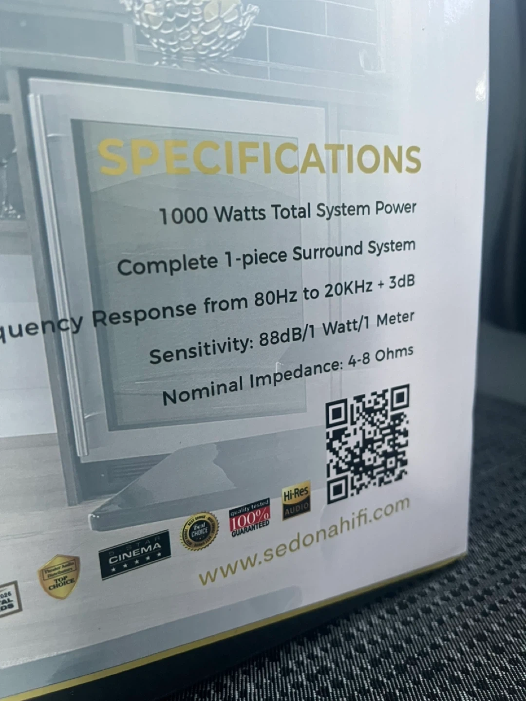 Sedona Hi-Fi SN14 soundbar. 1000 Watts total system power. Complete 1-piece surround system. Frequency response from 80Hz to 20KHz + 3dB. Sensitivity: 88dB/1 Watt/1 Meter. Nominal impedance: 4-8 Ohms.