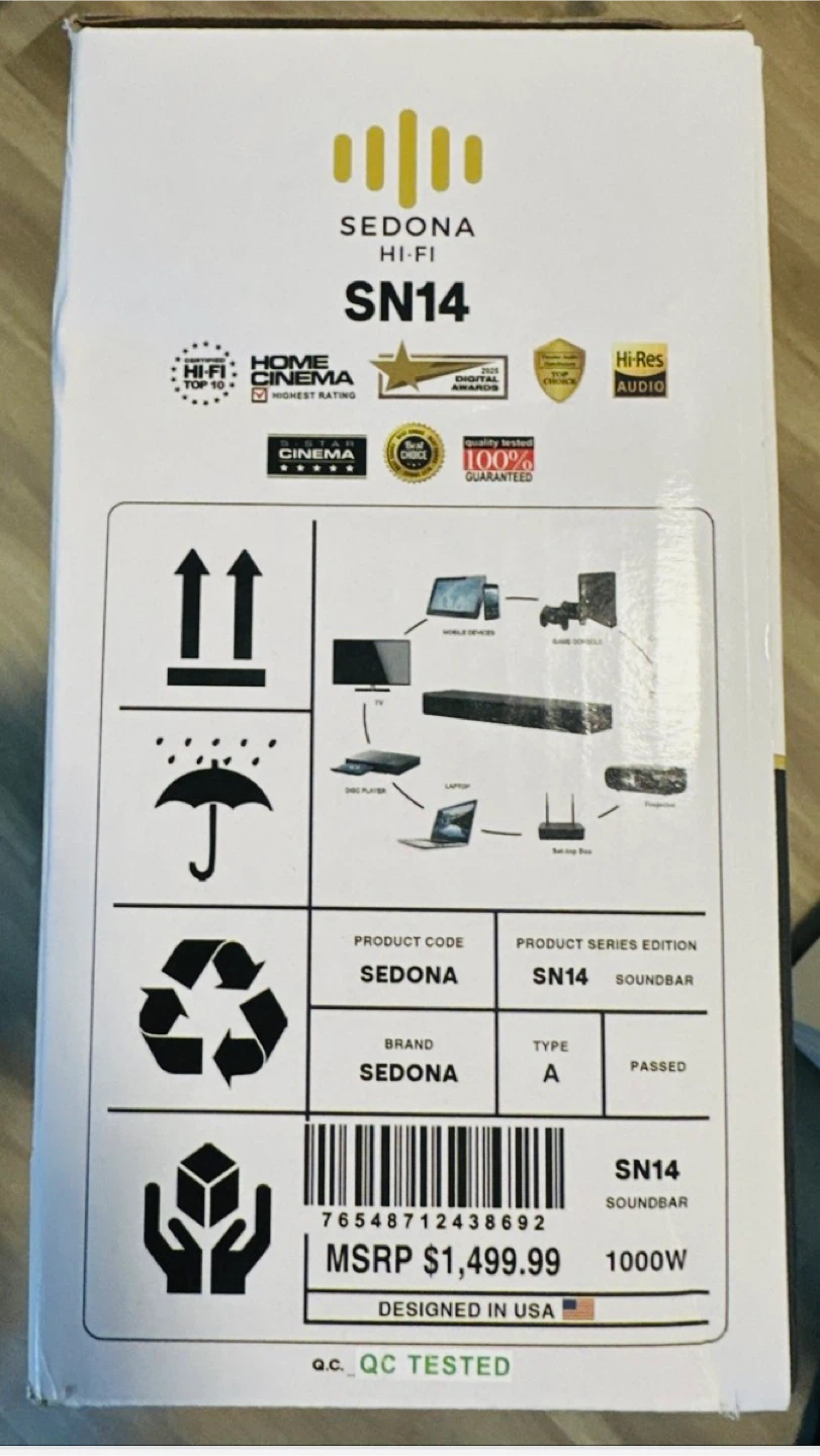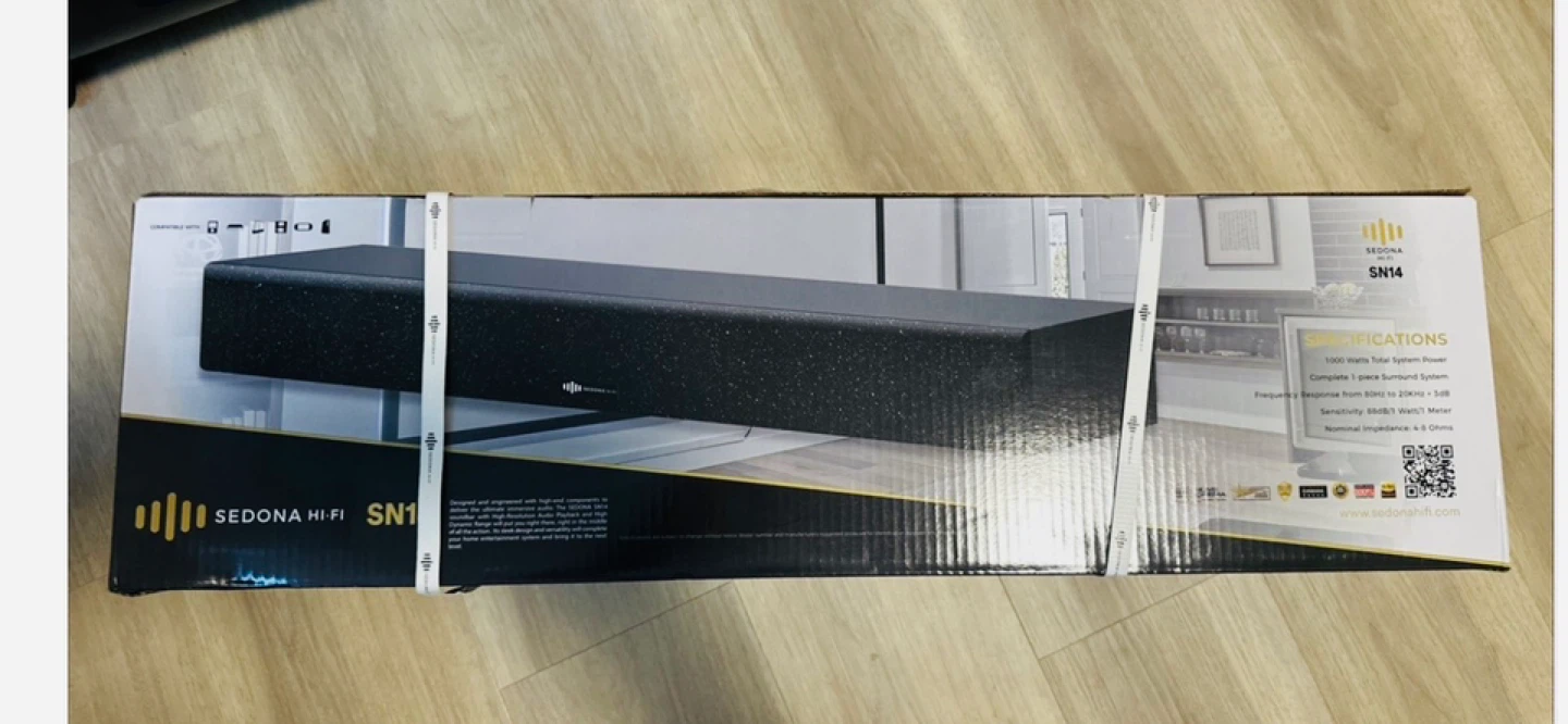 Sedona Hi-Fi SN14 soundbar. 1000 Watts total system power. Complete 1-piece surround system. Frequency response from 80Hz to 20KHz + 3dB. Sensitivity: 88dB/1 Watt/1 Meter. Nominal impedance: 4-8 Ohms.