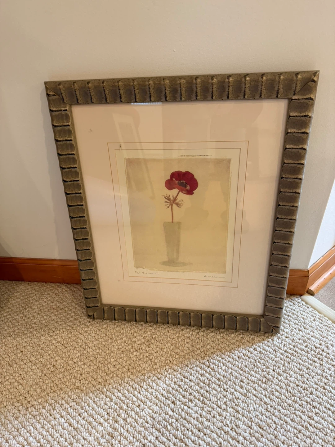 Framed art print featuring a red anemone flower in a vase. The frame has a textured, muted gold finish. The matting is a soft pinkish-beige. It's a lovely decorative piece for any room!