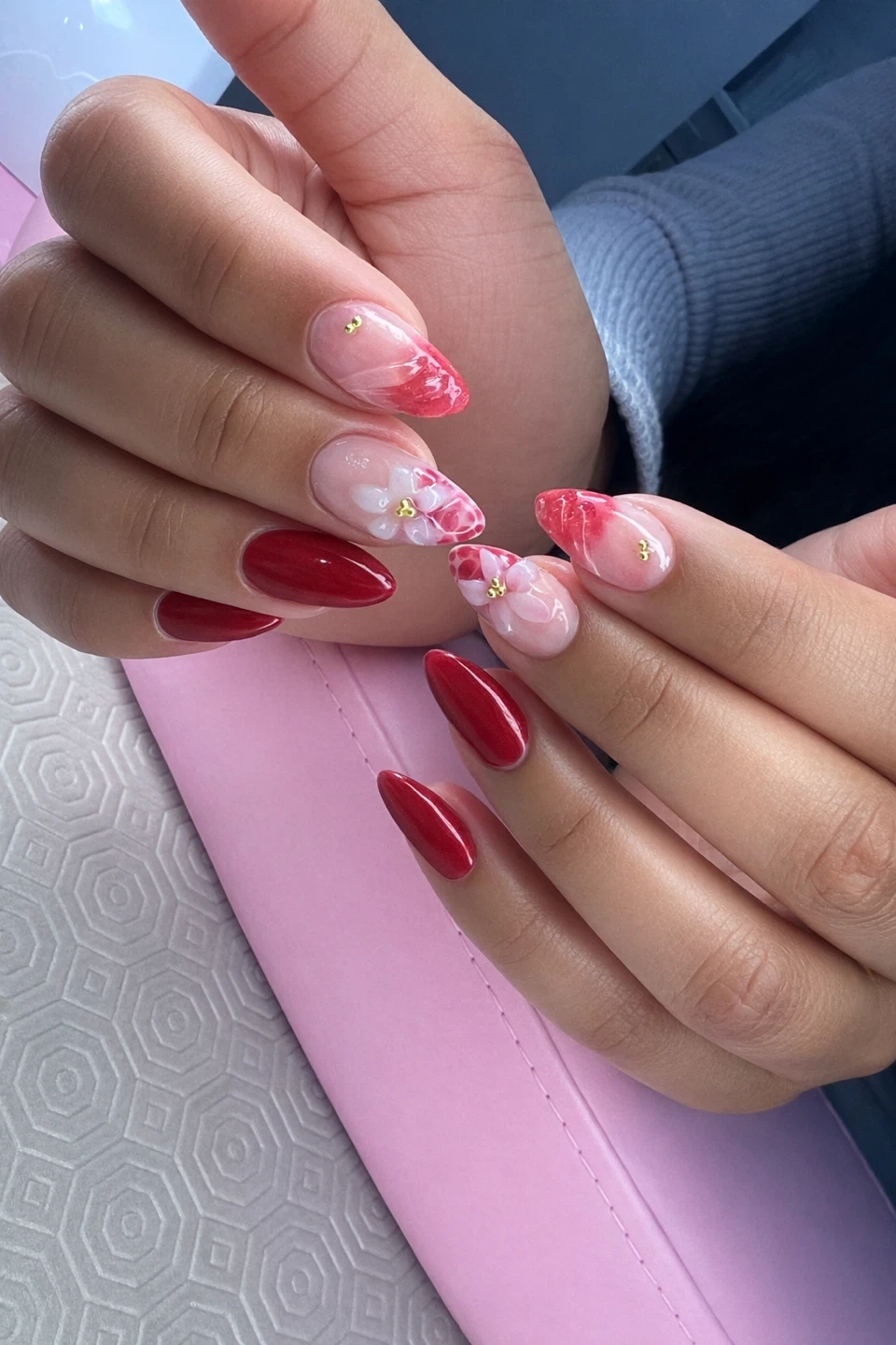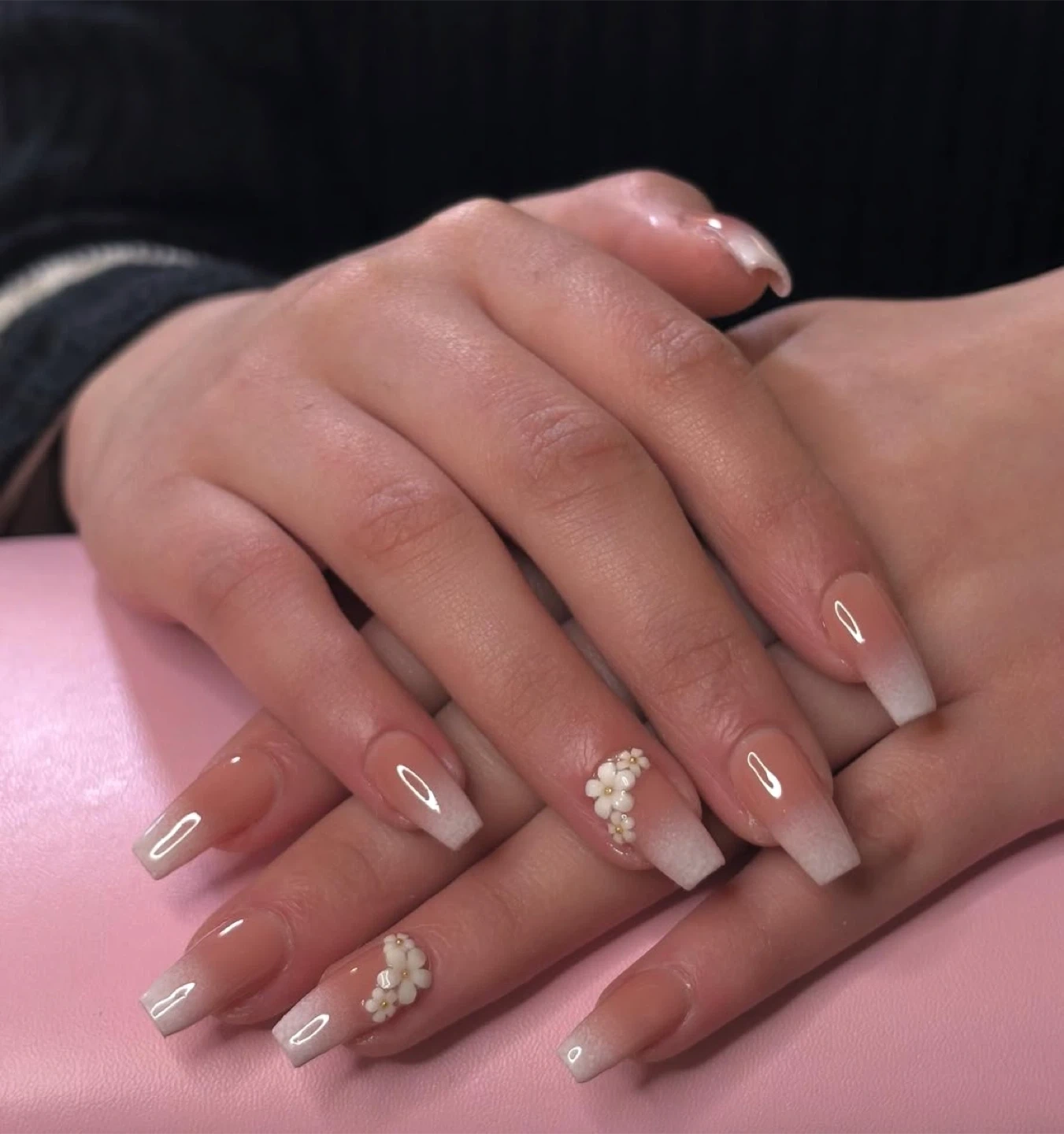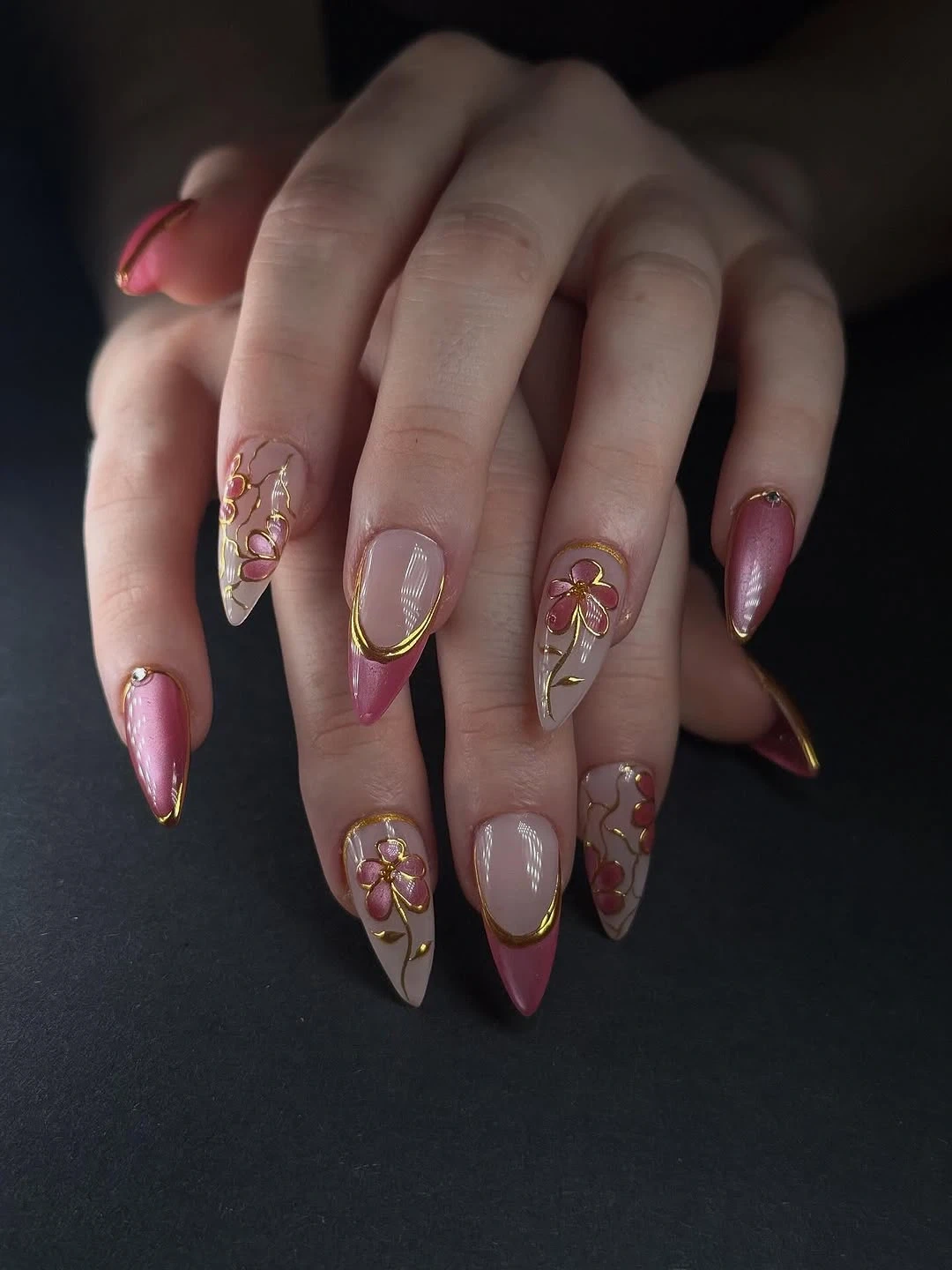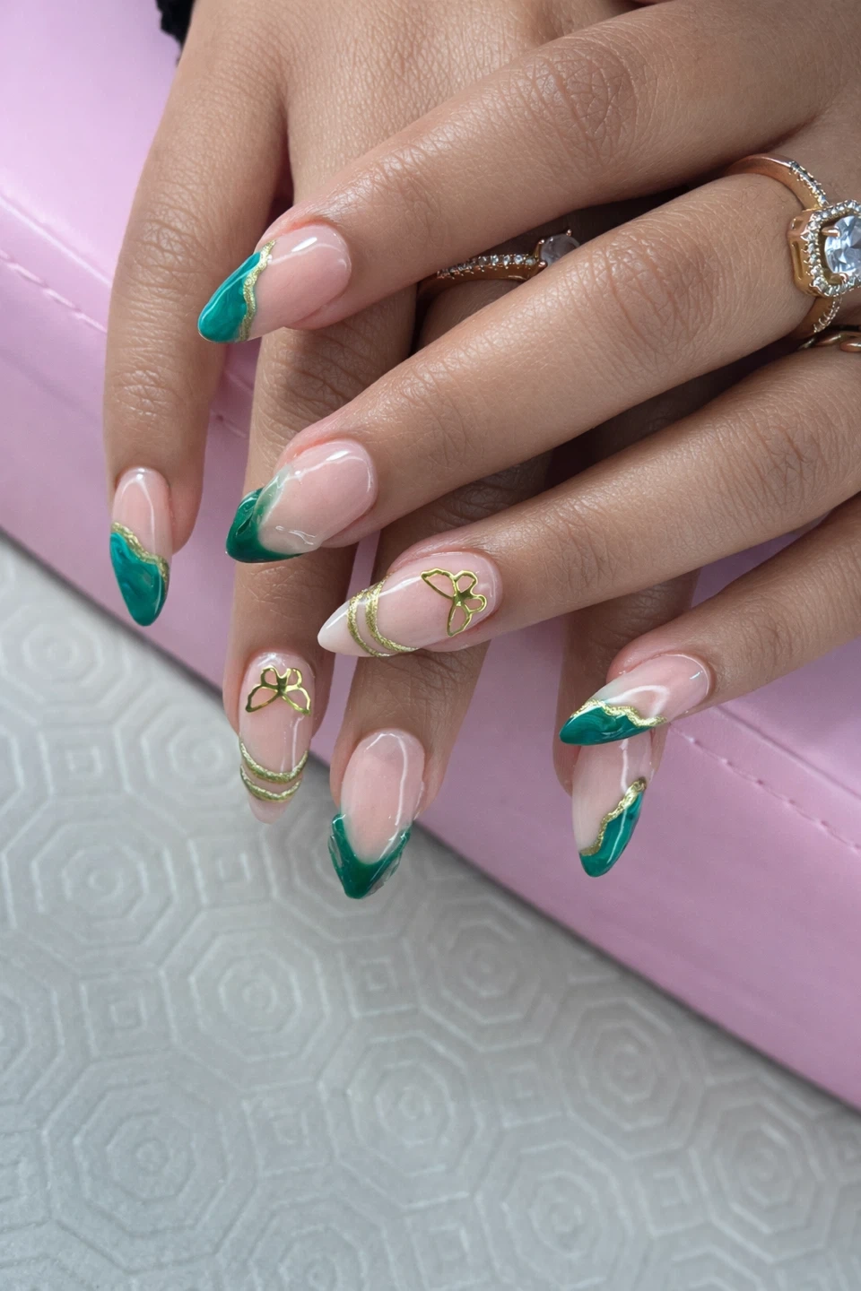 Beautifully crafted custom nail art featuring various designs. Choose from elegant floral accents, chic French ombre, or striking green and gold patterns. Perfect for adding a touch of flair to any occasion!