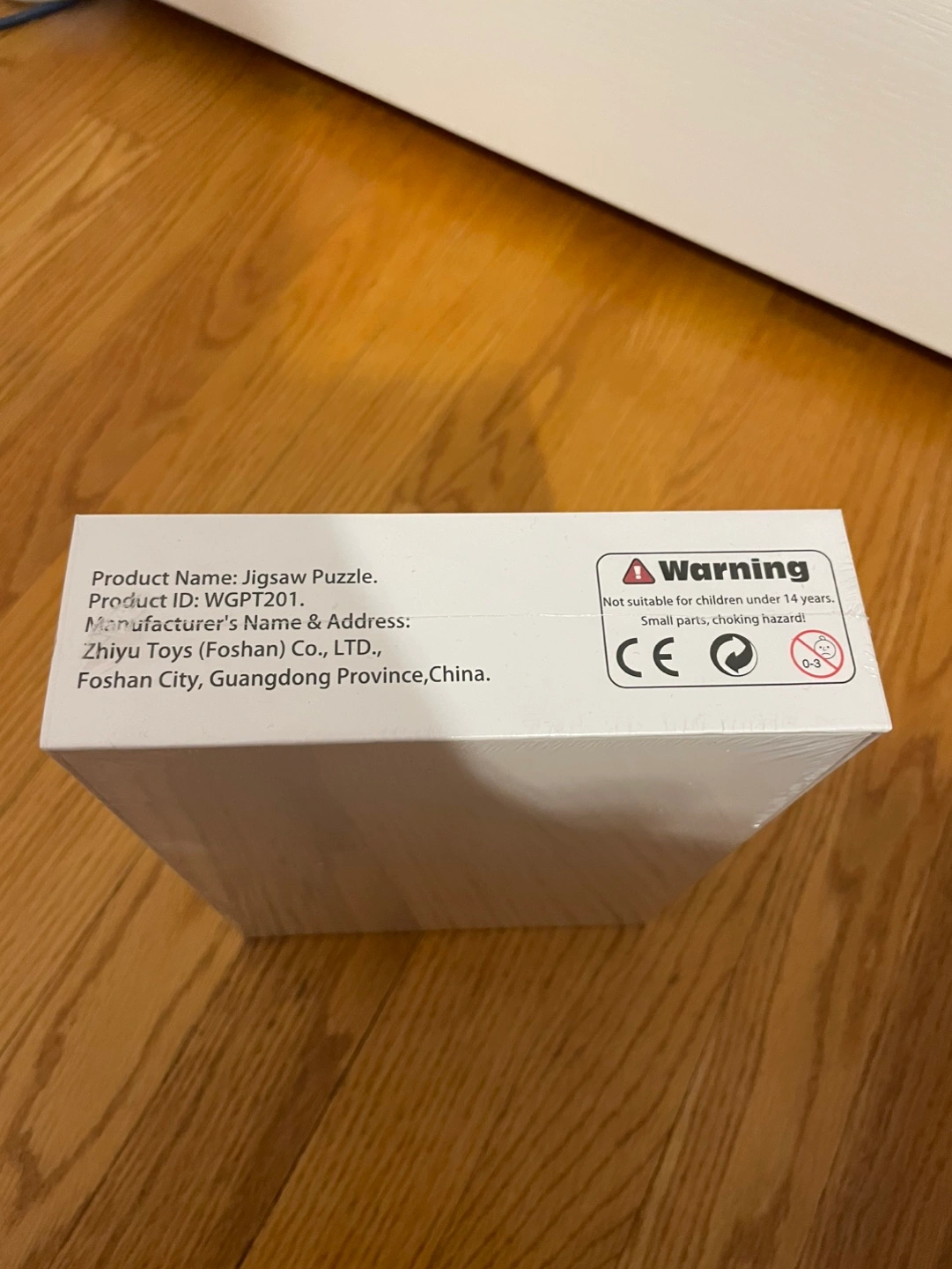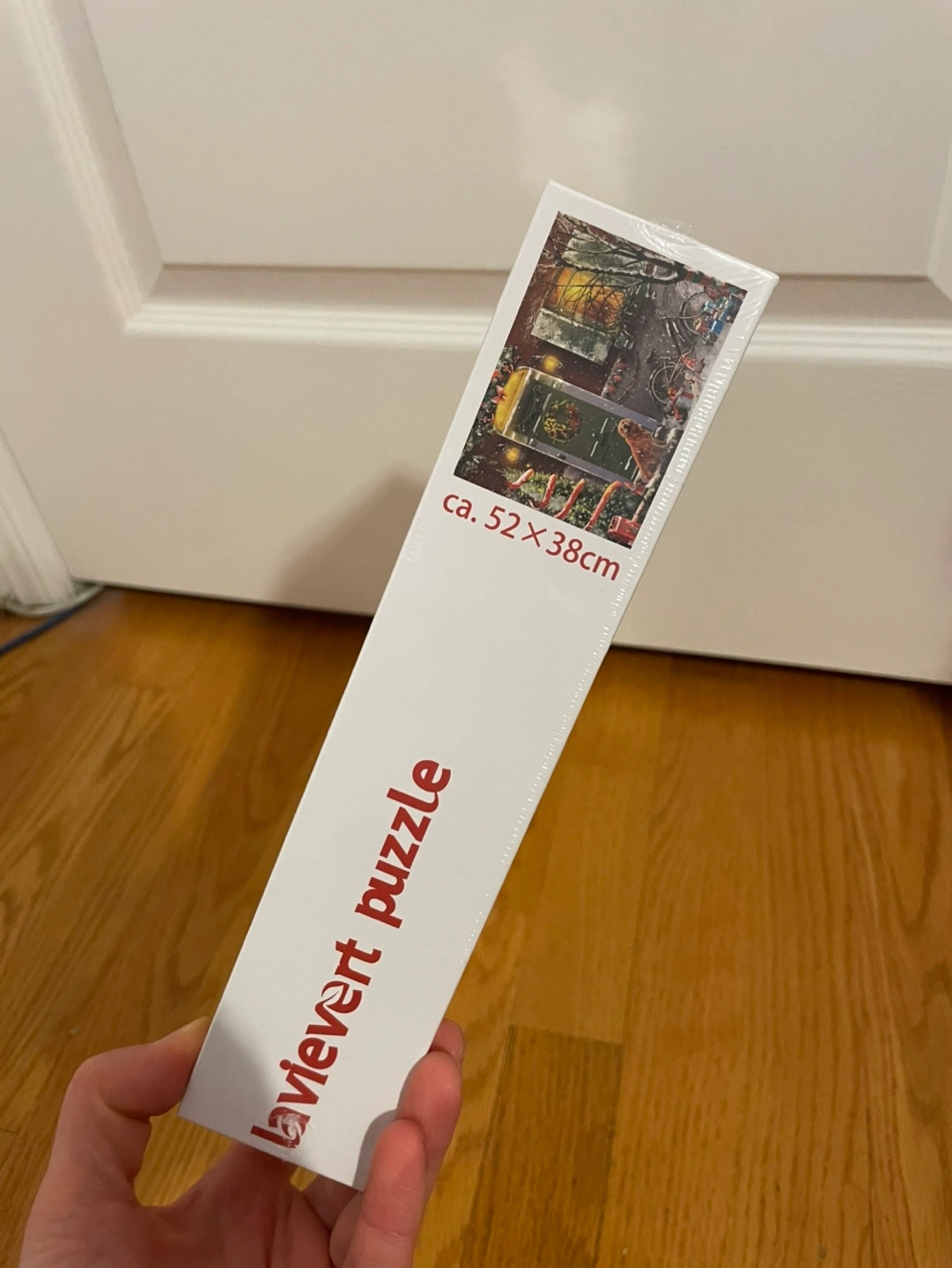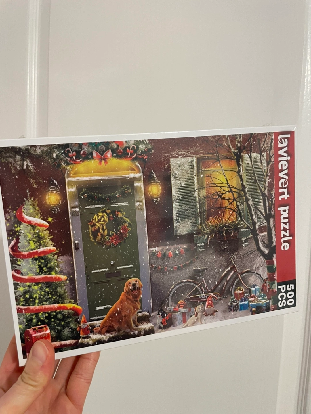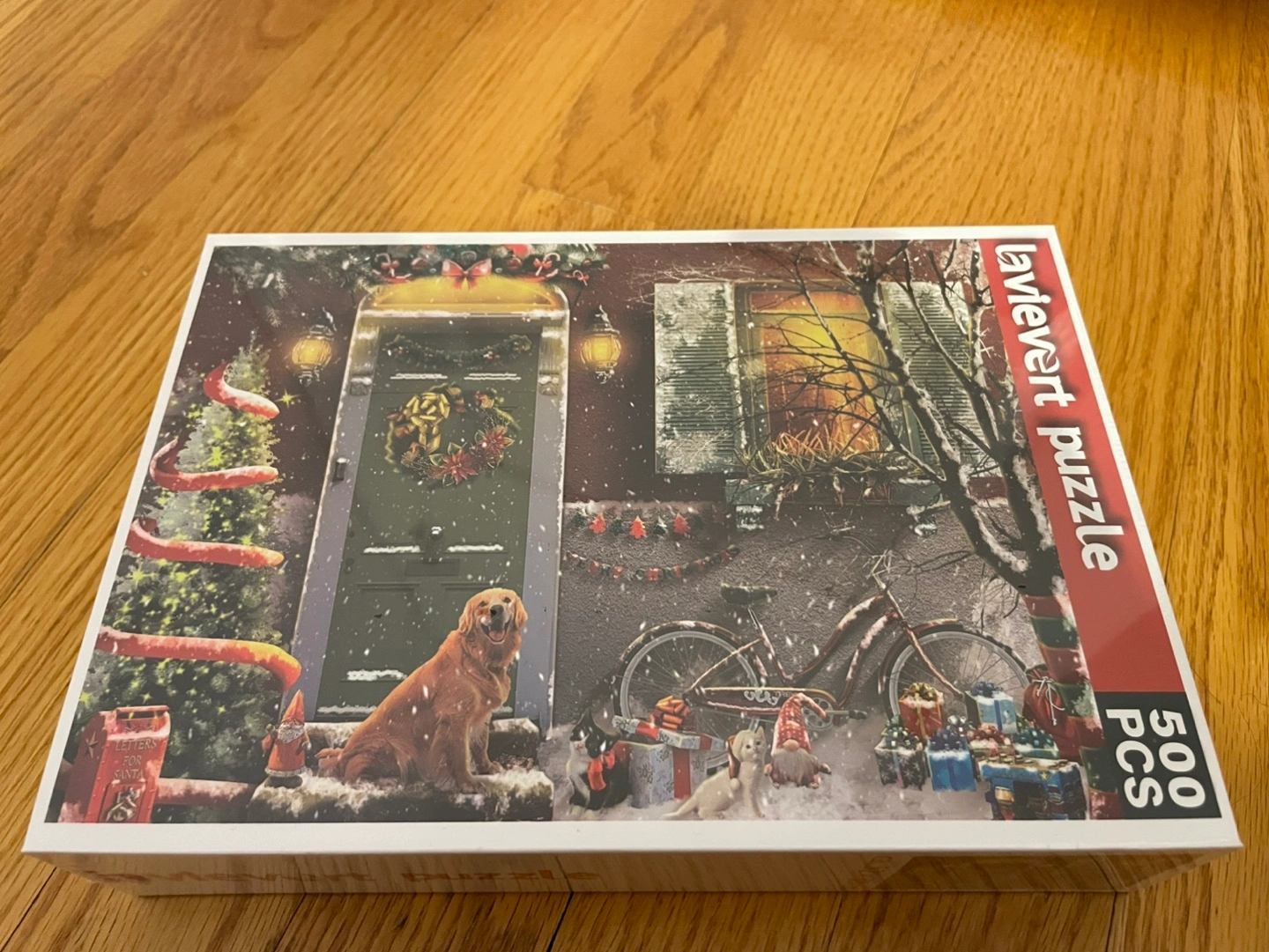 500-piece jigsaw puzzle. Features a Christmas scene with a house, dogs, and presents. Snowing.