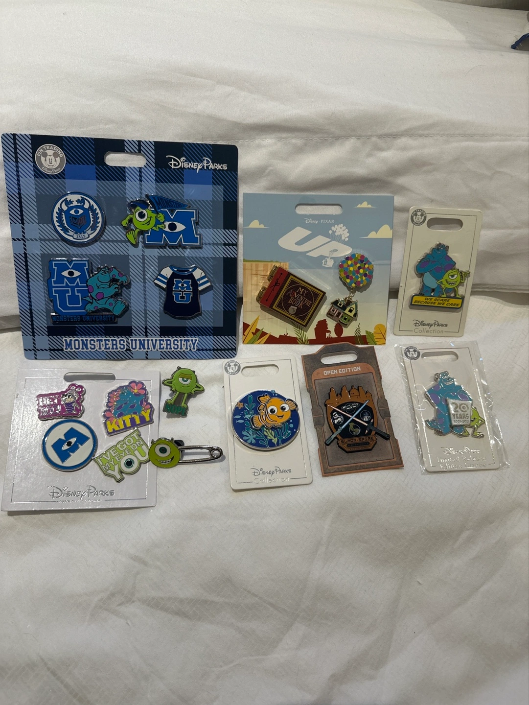 Collection of 18 Disney Parks enamel pins. Various characters and designs. Includes Monsters University, Up, and other Disney and Pixar themes. Some on original cards.