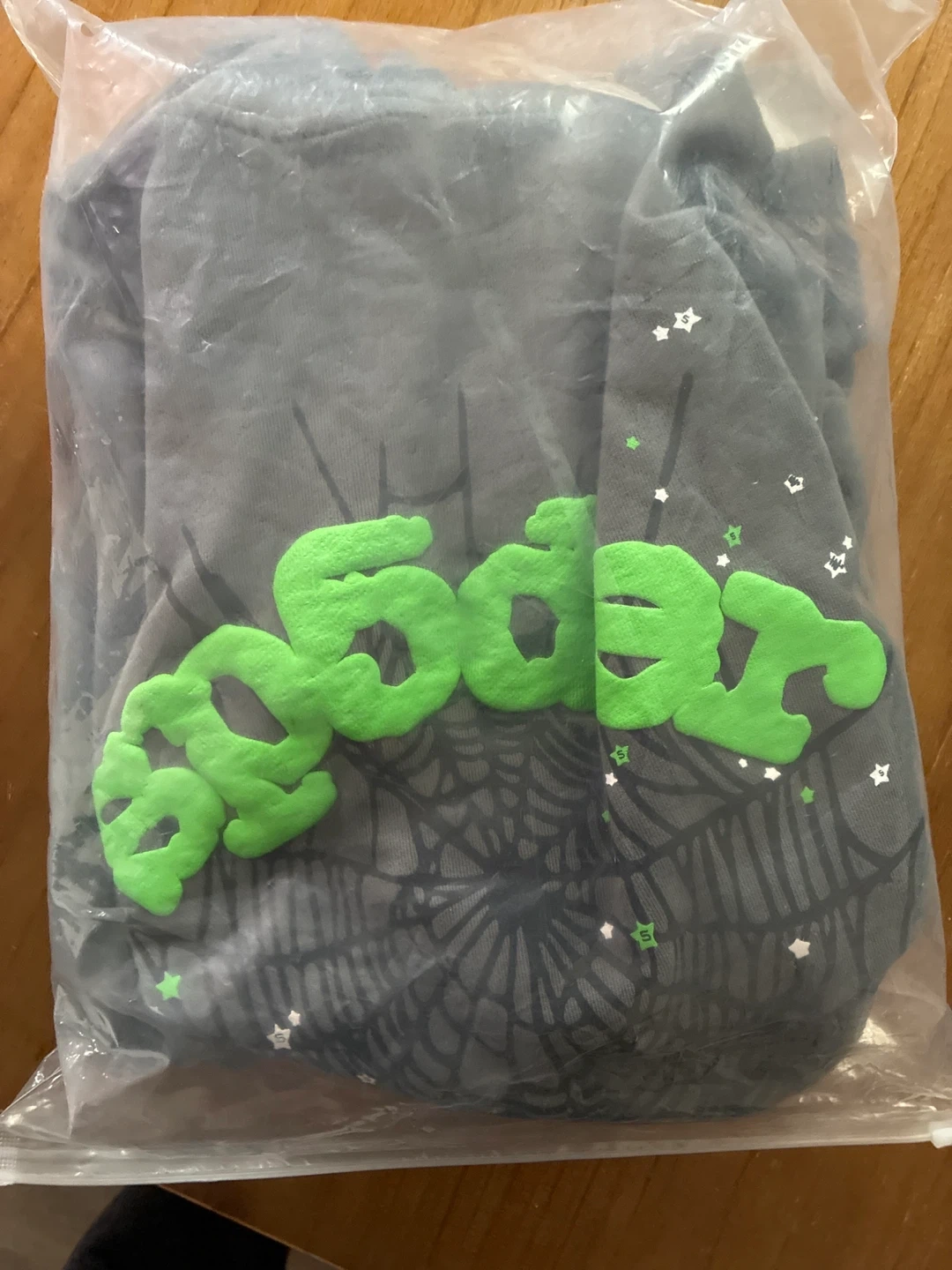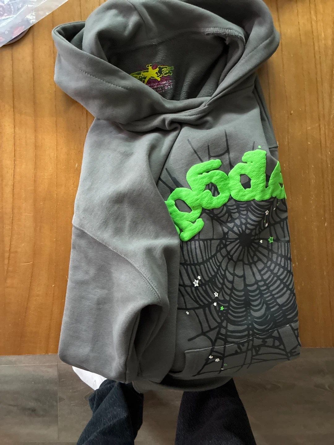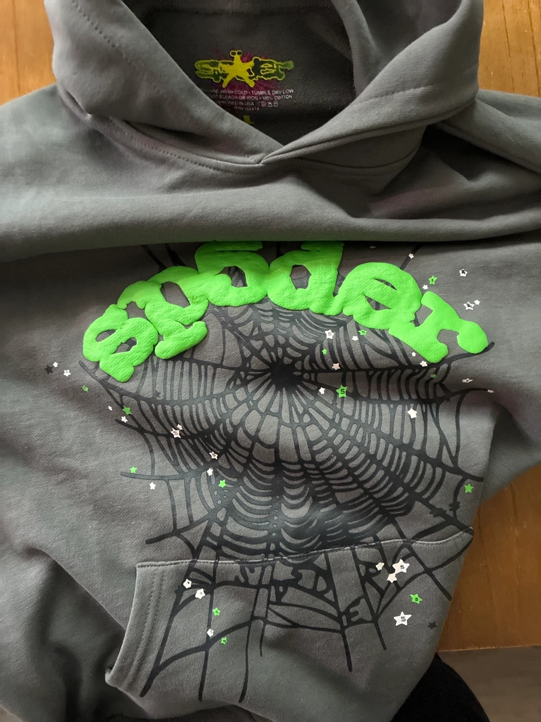 This grey hoodie features a bright green "Sp5der" graphic with a spider web design. It's made from 100% cotton for comfort. This would be great for streetwear!