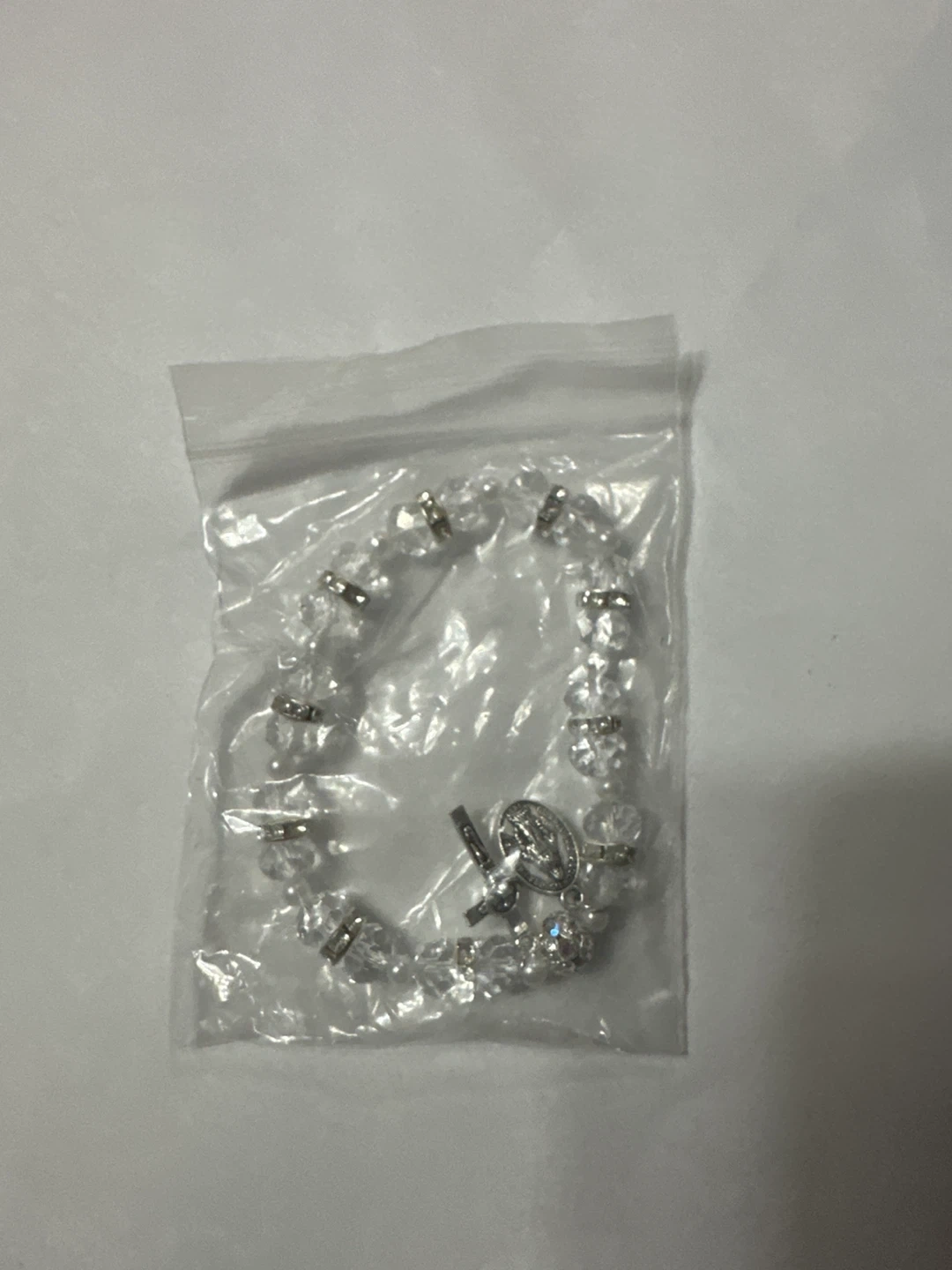 Selling a beautiful crystal rosary bracelet! It features clear crystals, pearl-like beads, and a small cross and medallion. Perfect for adding a touch of elegance to your outfit or as a thoughtful gift