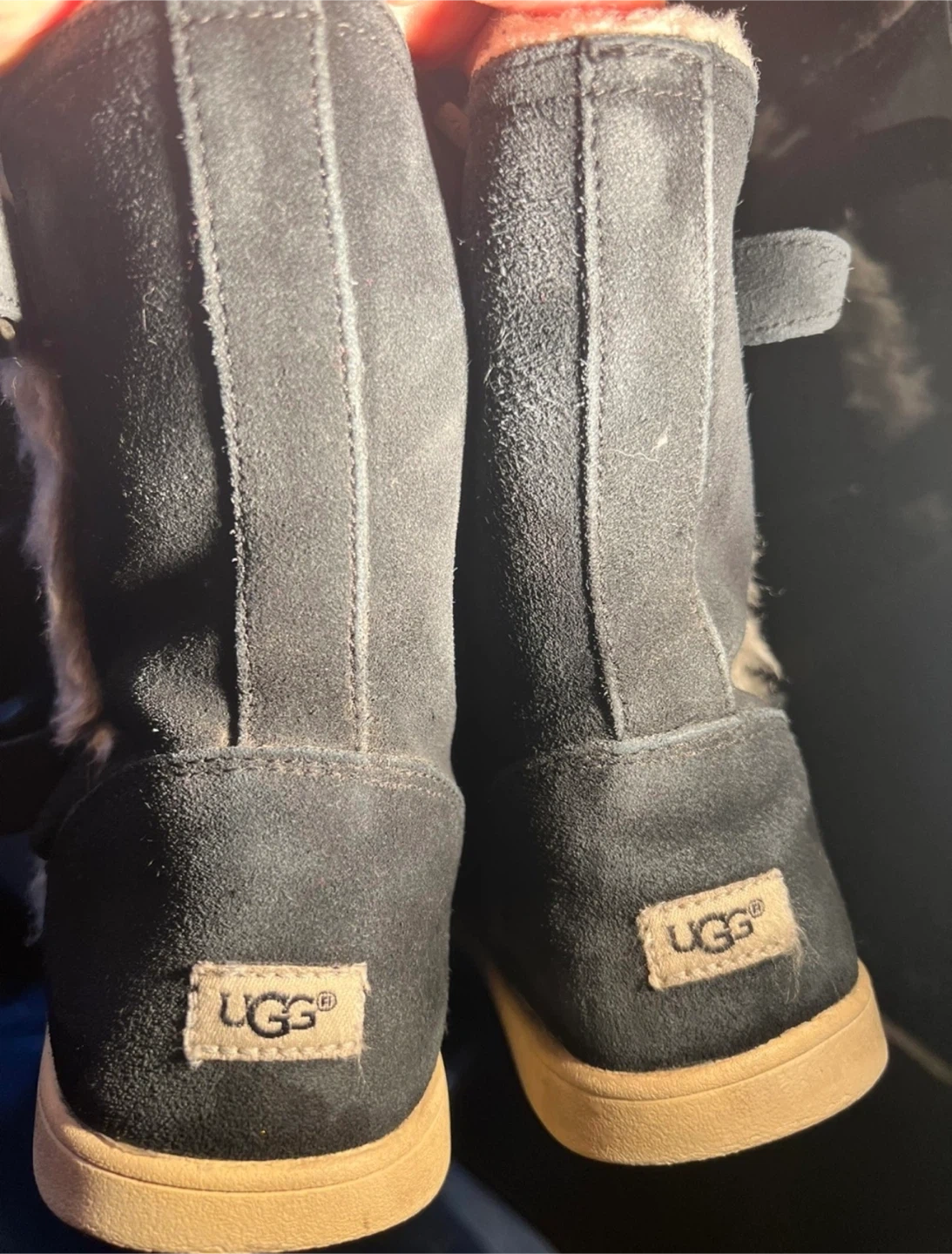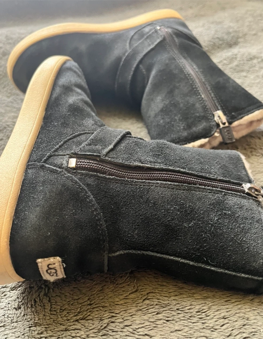 Cozy UGG boots featuring black suede exterior and warm sheepskin lining. They have side zippers for easy on and off. Perfect for keeping your feet warm and comfortable during cooler weather!