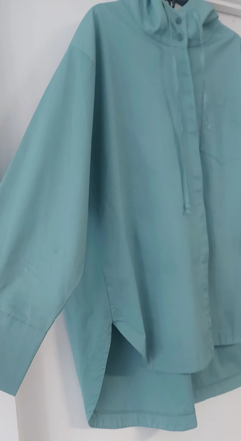 This is a women's hooded button-up shirt in a lovely teal colour. It has a chest pocket and adjustable drawstring details at the neck. It's made of a lightweight fabric perfect for layering. This shirt is great for casual everyday wear! To - XXL