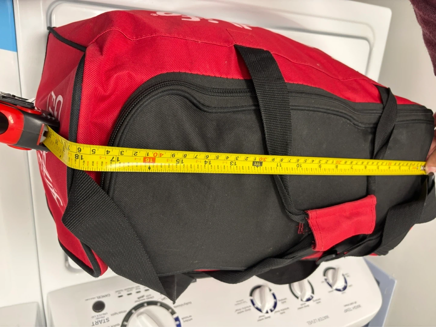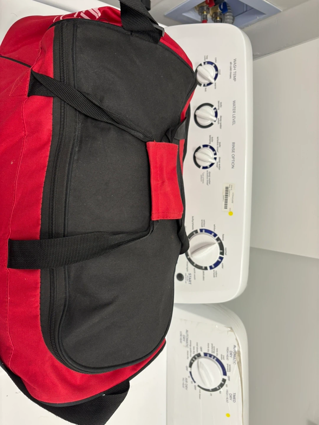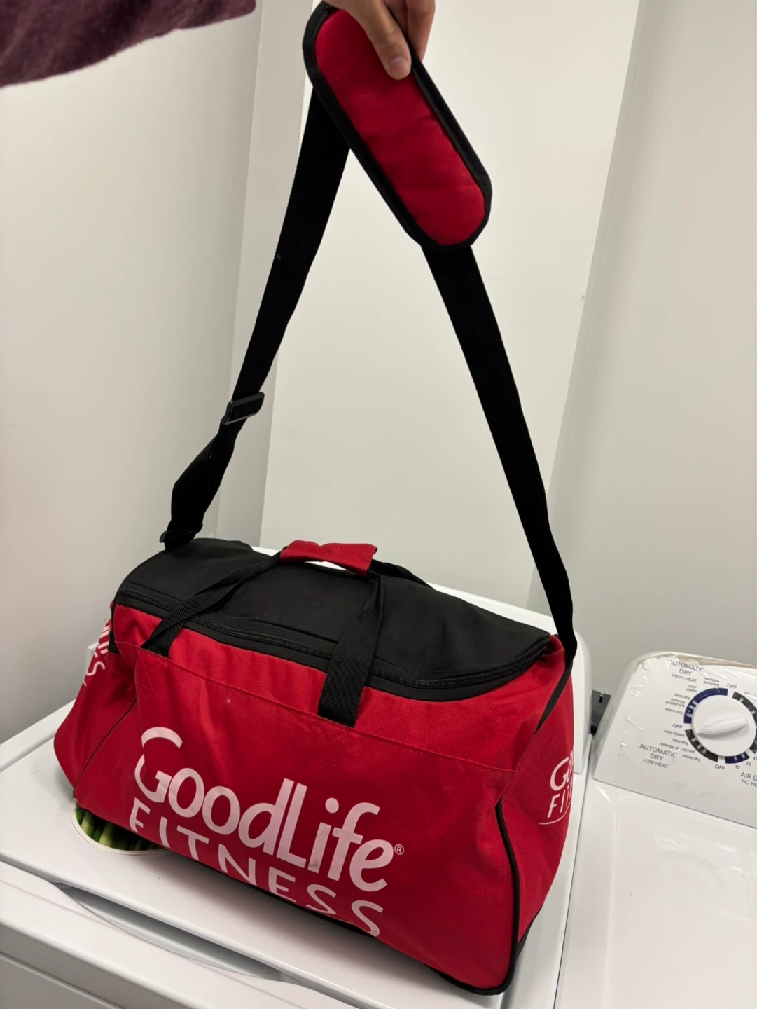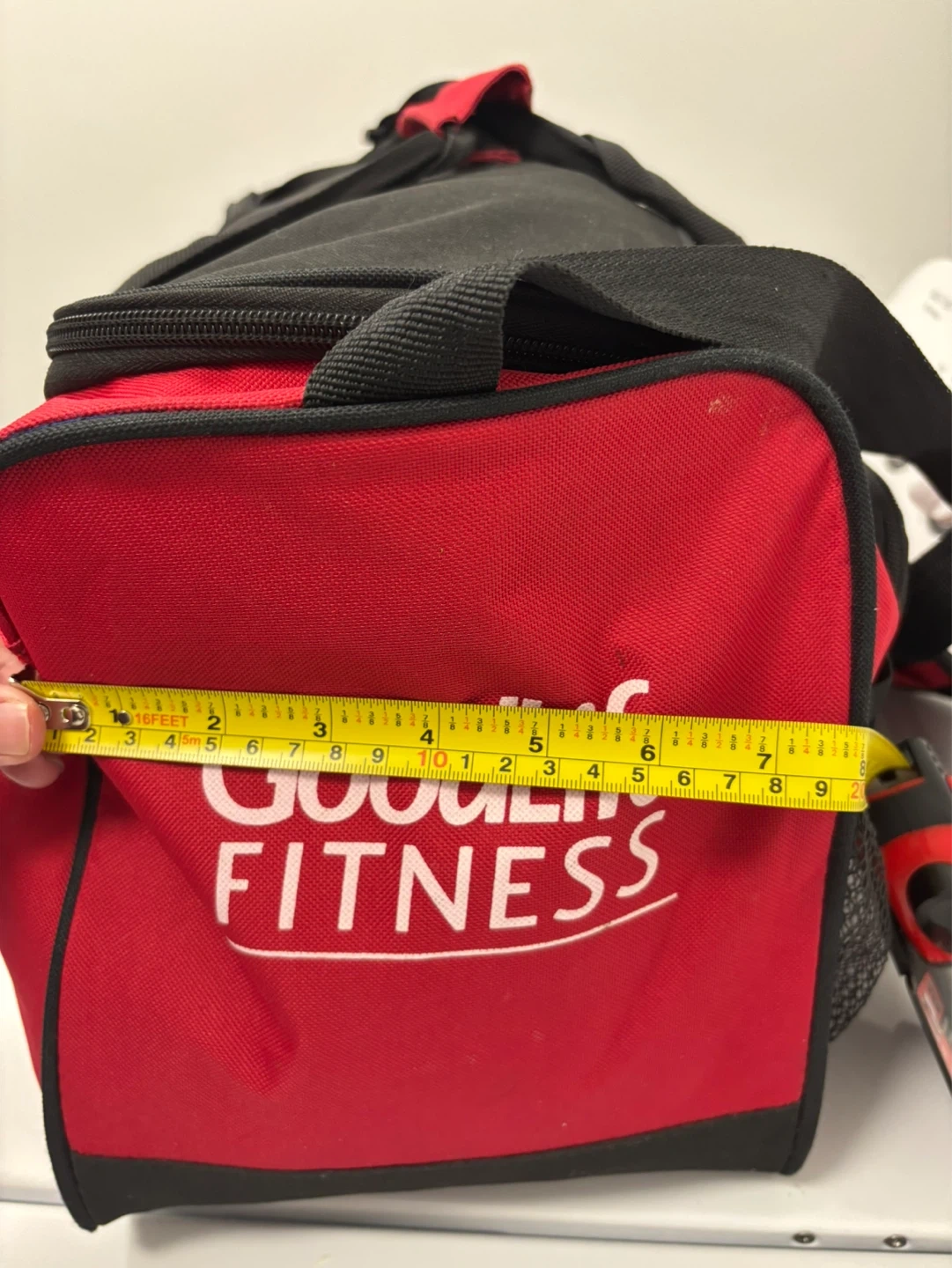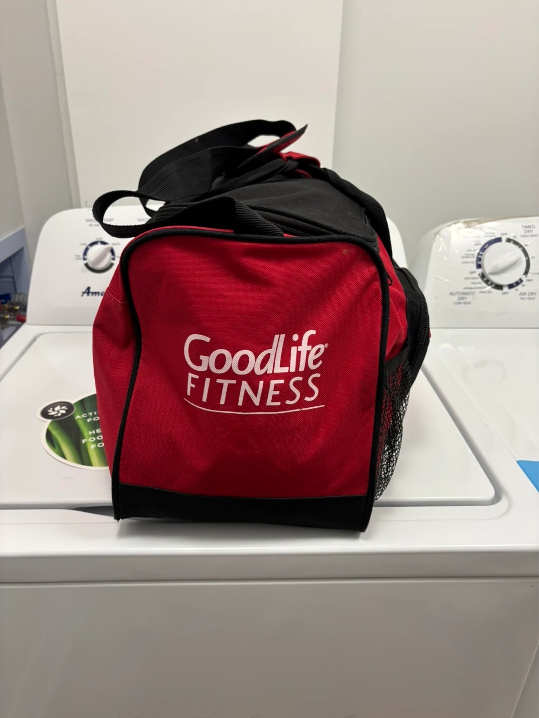 This red duffel bag features the GoodLife FITNESS logo. It has a main zippered compartment and external pockets. Comes with dual carry handles and an adjustable shoulder strap.