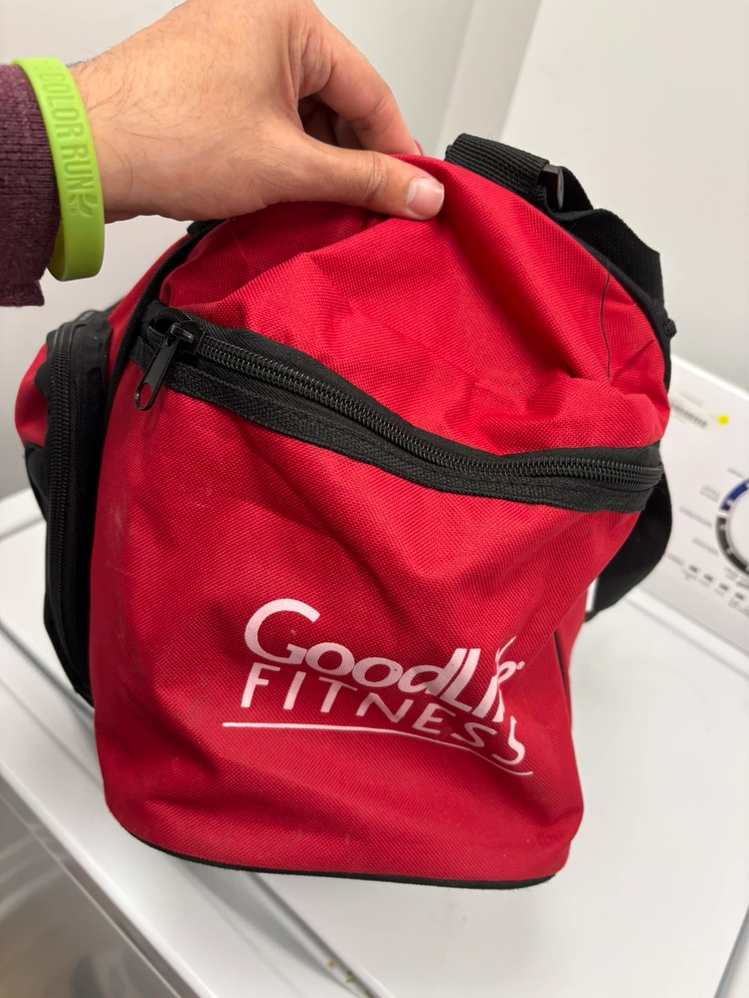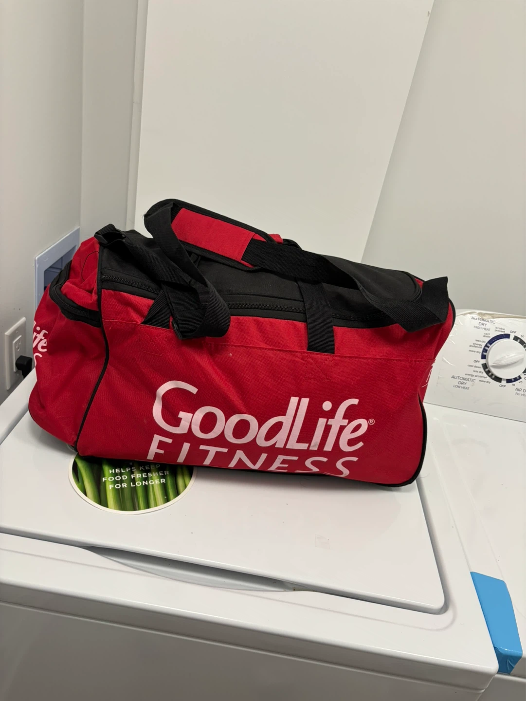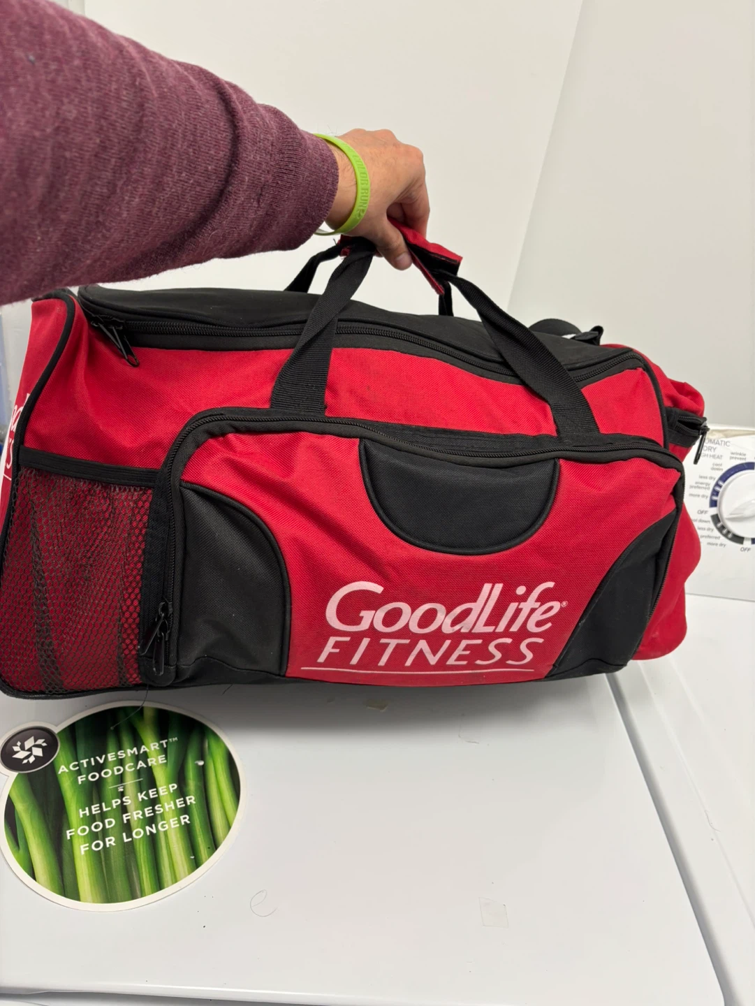 This red duffel bag features the GoodLife FITNESS logo. It has a main zippered compartment and external pockets. Comes with dual carry handles and an adjustable shoulder strap.