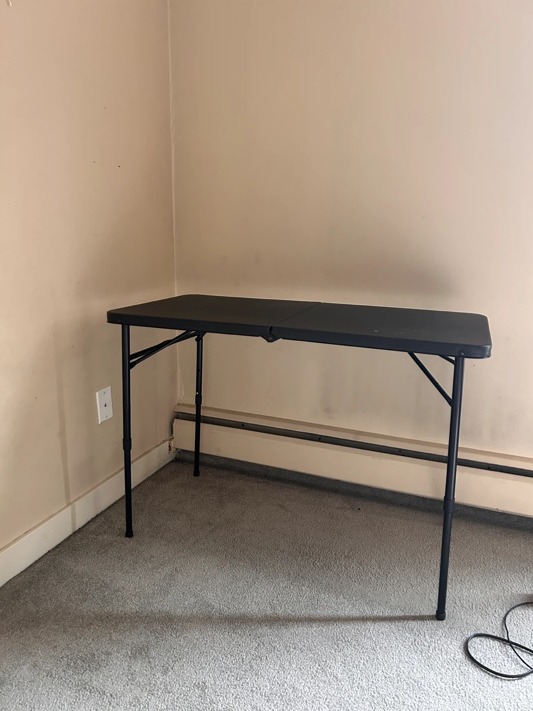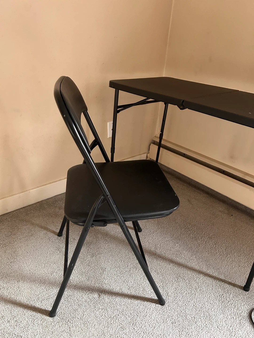 A black folding table and one matching folding chair. It's lightweight and easy to set up. Perfect for extra seating or workspace!