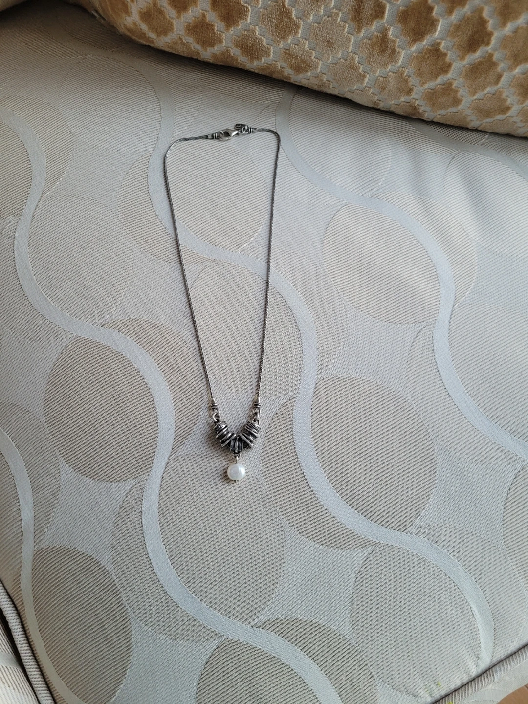 A lovely sterling silver necklace featuring a single pearl. It's made with 925 silver and has an adjustable clasp. This piece would make a nice addition to any jewellery collection.