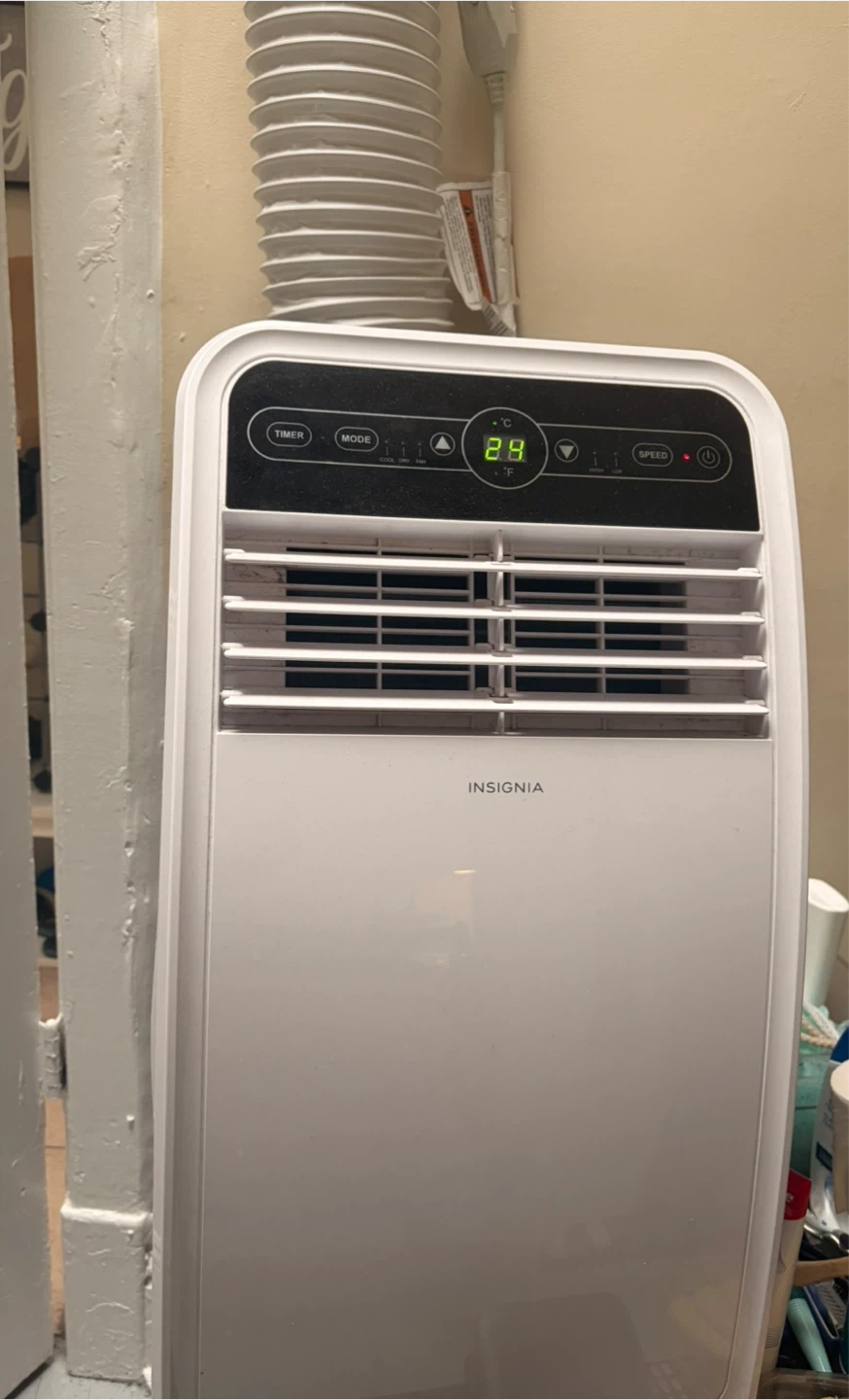 This is a white Insignia portable air conditioner. It has multiple modes including cool, dry, and fan. The unit displays the temperature and speed settings. Comes with control