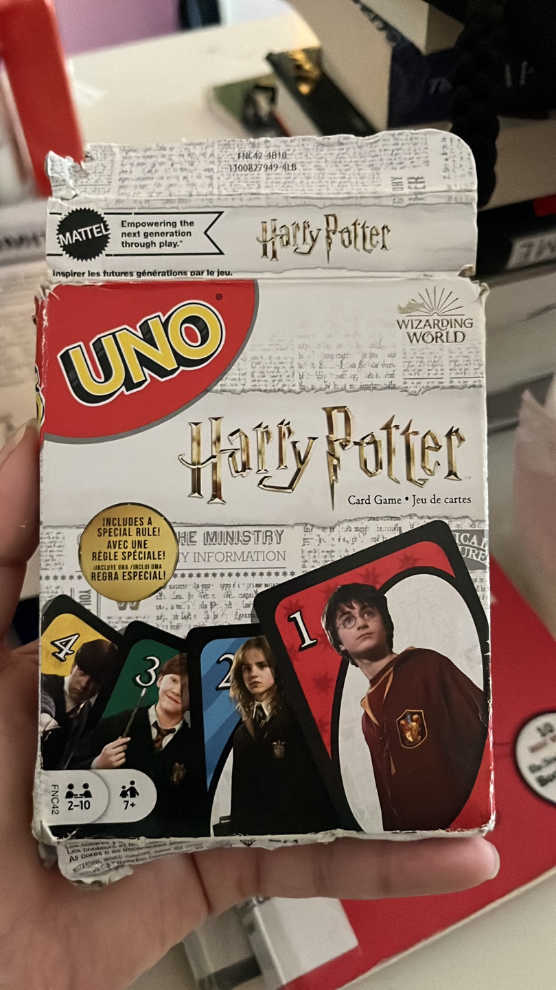Selling a Harry Potter themed UNO card game by Mattel! It includes a special rule to make the game even more fun. Recommended for ages 7+, and for 2-10 players. Great for family game night!