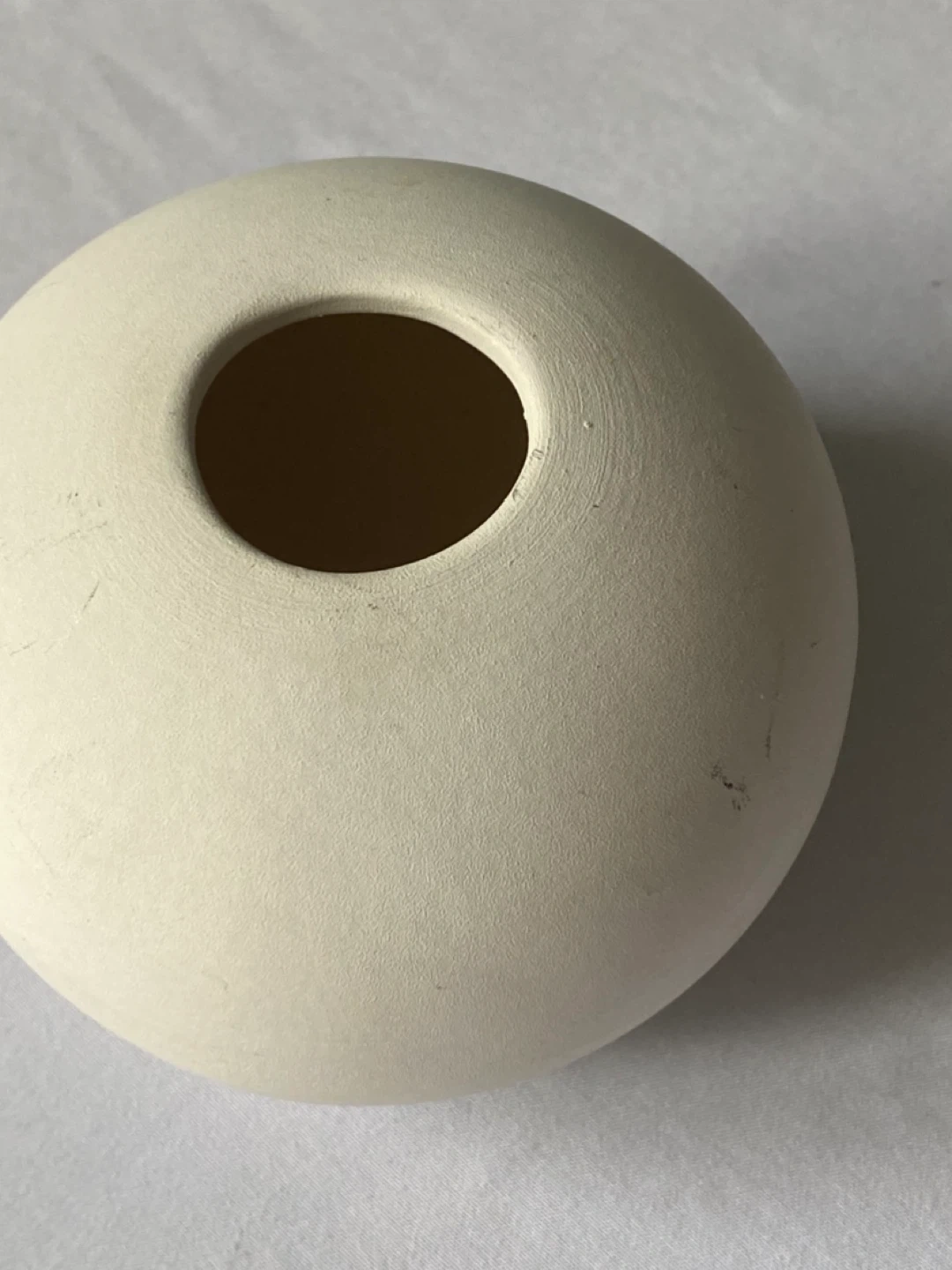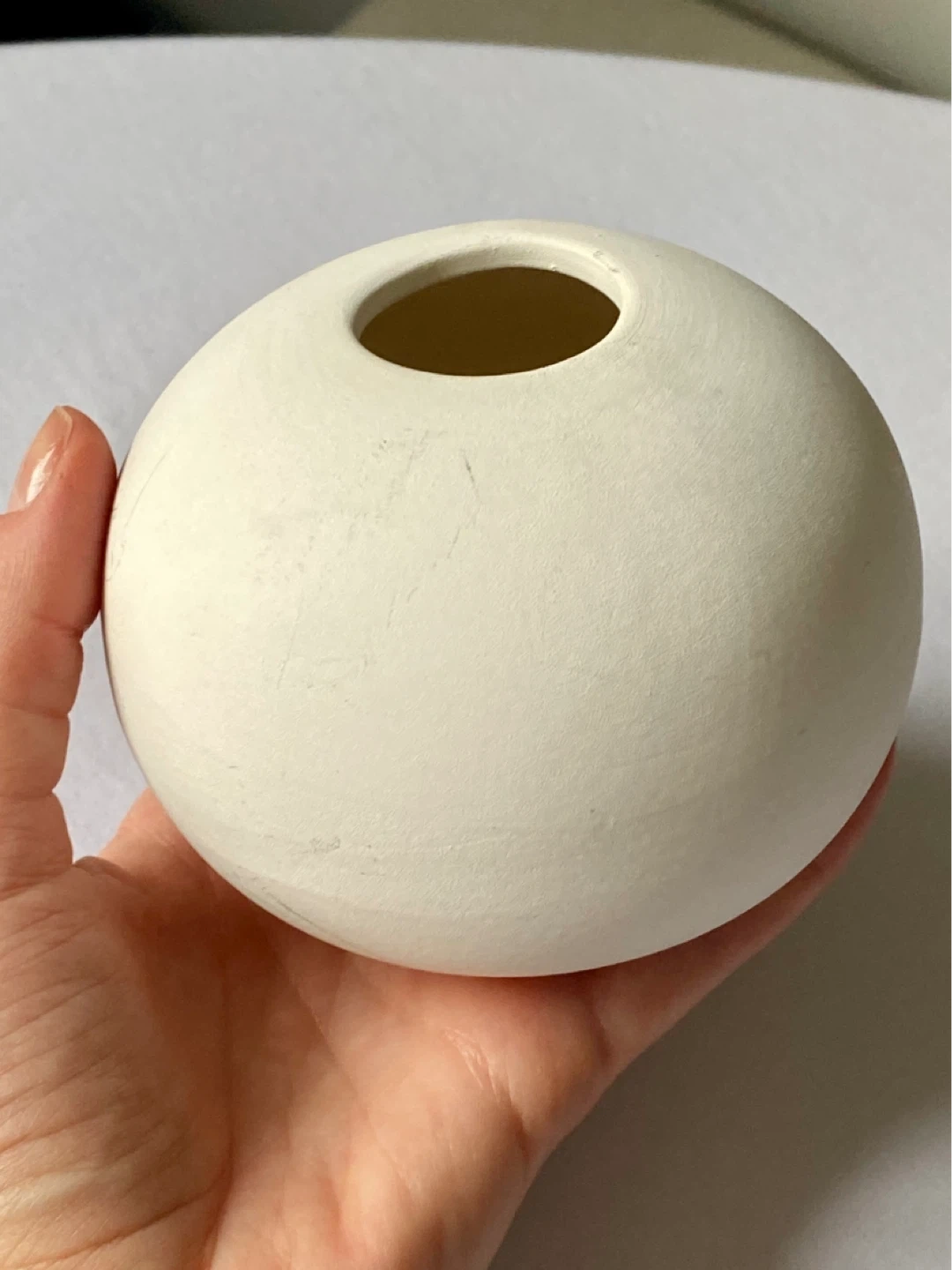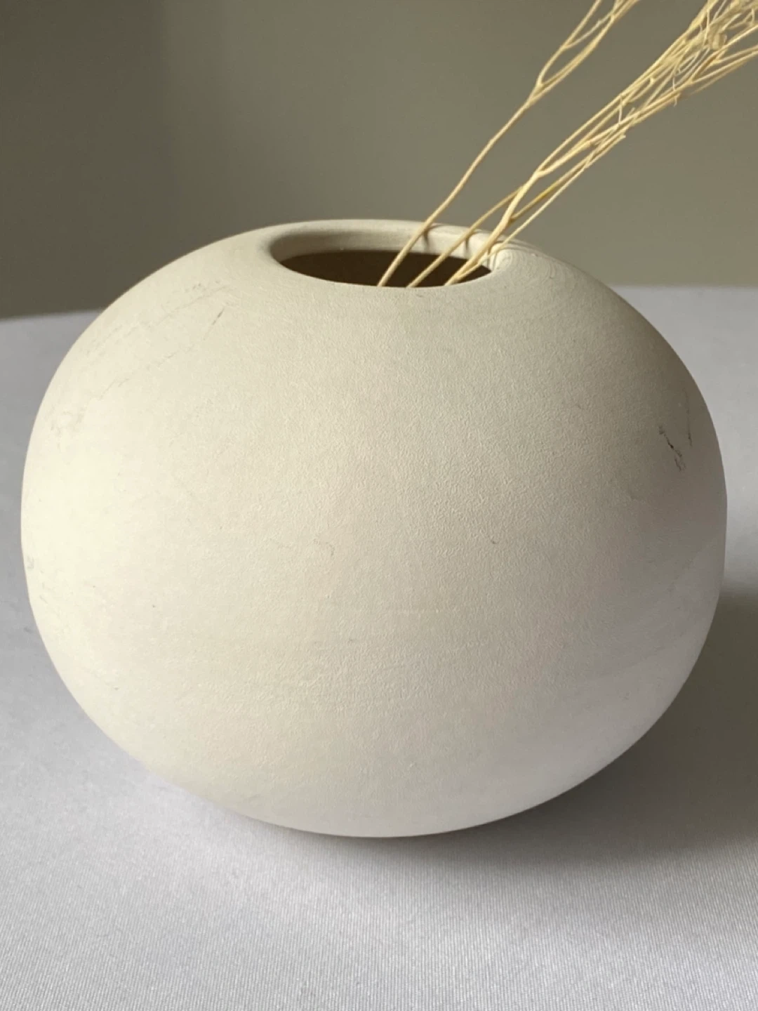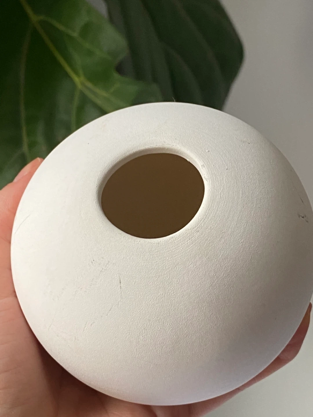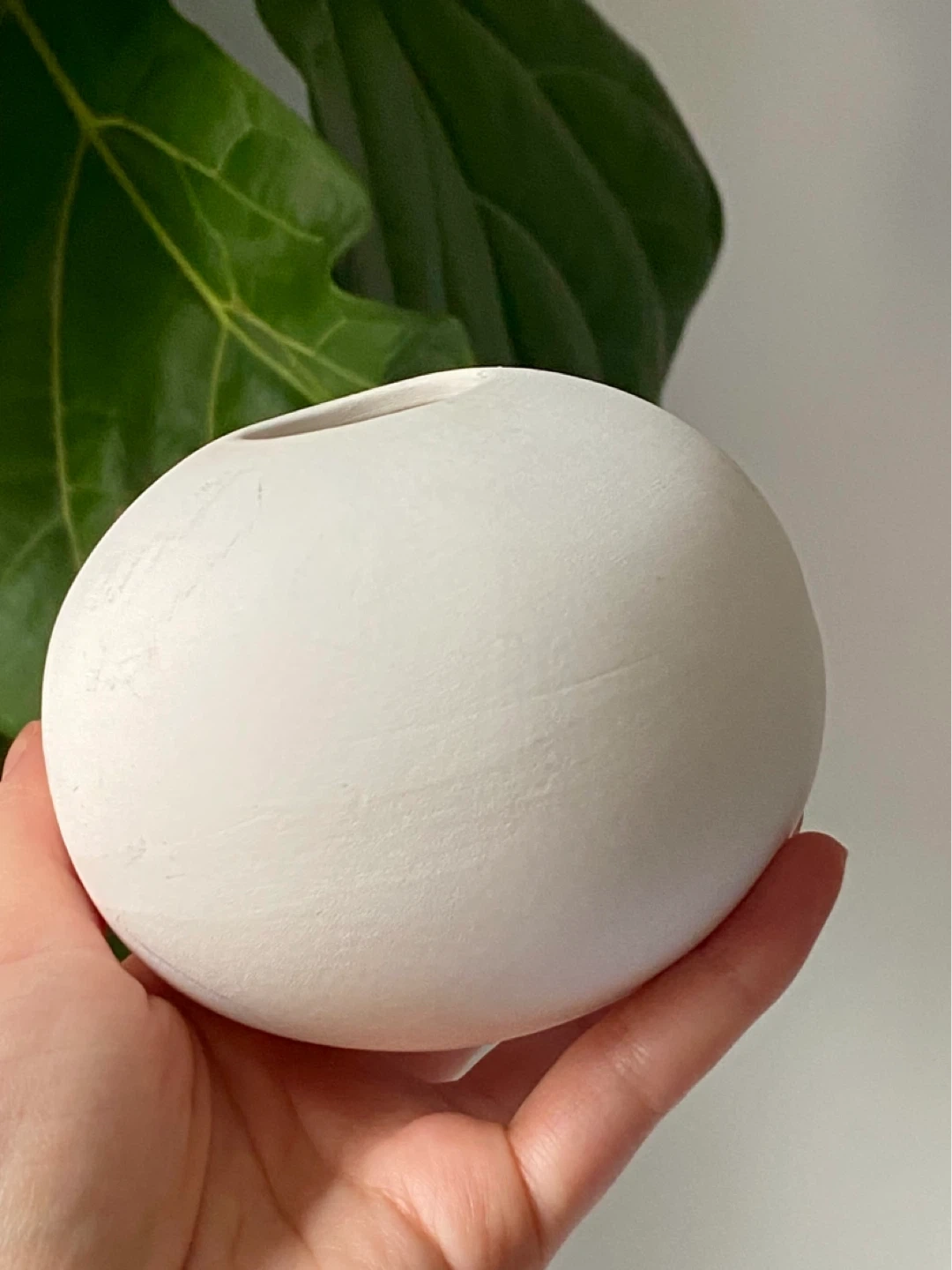 This matte white ceramic vase has a unique spherical shape and a smooth finish. It's perfect for displaying dried flowers or small bouquets. The opening is about 2 inches wide.