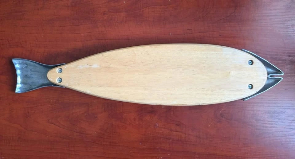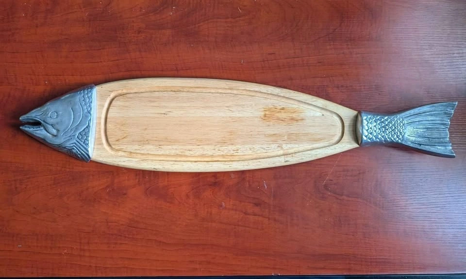 This piece is in the shape of a Salmon and perfect for cutting and serving cooked fish or as a passing tray for h’ordeuvres. The center is a blond wood with the head and tail formed in metal.