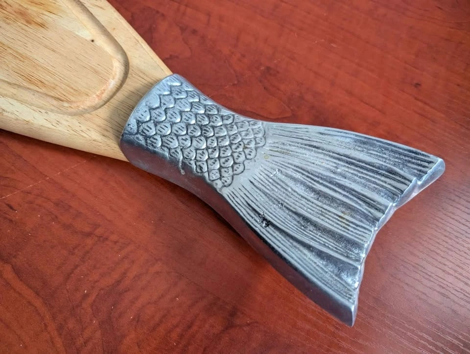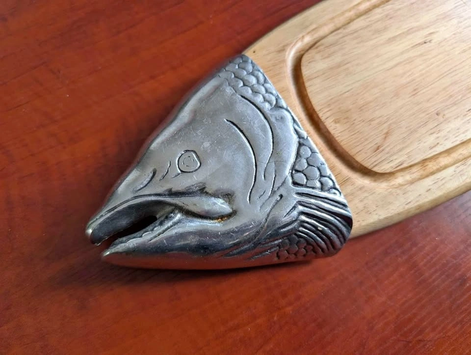 This piece is in the shape of a Salmon and perfect for cutting and serving cooked fish or as a passing tray for h’ordeuvres. The center is a blond wood with the head and tail formed in metal.